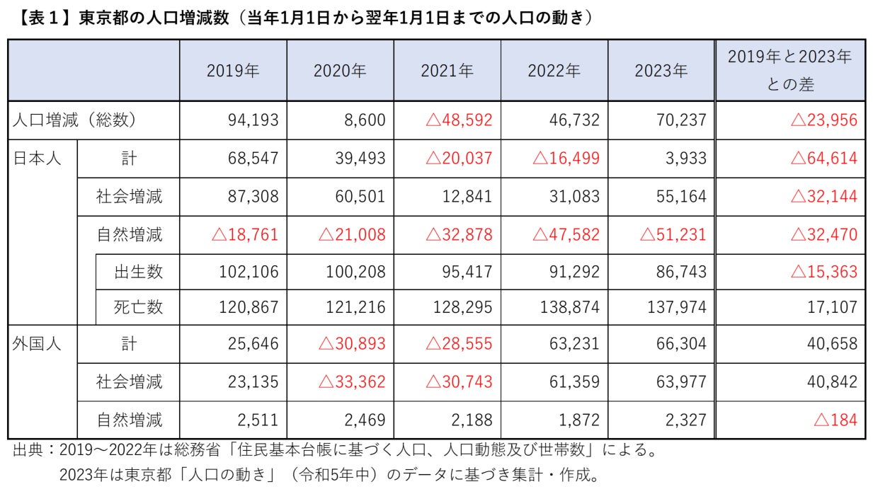 2023年にアフターコロナを迎えて社会経済活動の正常化が進み、日本人、外国人とも社会増減数が大幅増に転じることで東京都の人口増加に大きく寄与しました。しかし、日本人の動向に限ってみると、自然増減数のマイナス幅の拡大、すなわち少子化と多死社会の進行がやや影を落としています。