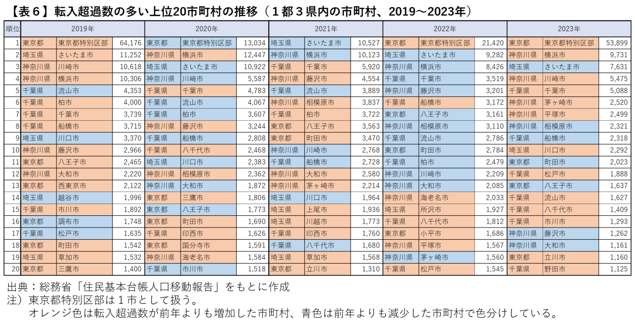 この5年間で東京圏(1都3県)内のどの市町村に人口が集まってきたのか、すなわち転入超過数が多かったのかをみていきます。以下は、2019年から23年にかけての転入超過数が多い上位20市町村の推移の表です【表6】。
