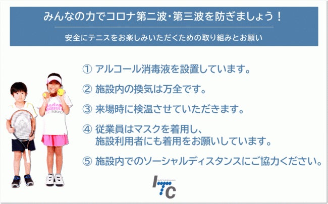 ITCテニススクールでは、子どもたちが、たのしく、真剣に、そしてなにより安心して、テニスにとりくめるよう、徹底した新型コロナウィルス対策をおこなっています。