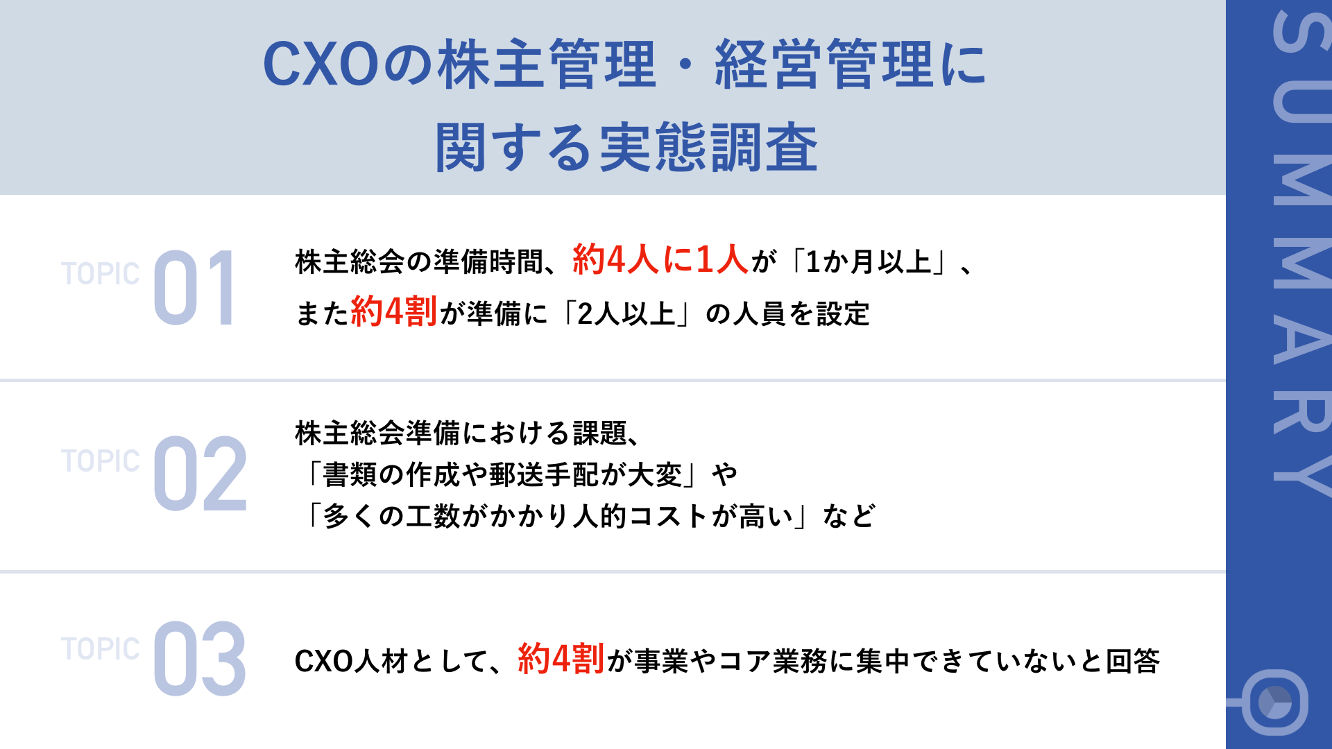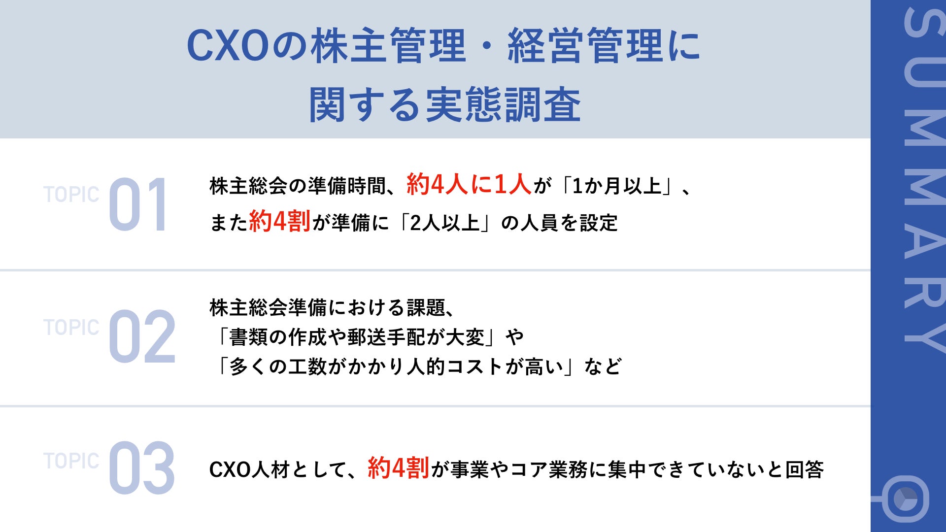 株主総会の準備において、「1ヶ月以上」の期間や「2人以上」の人員を必要としている企業が少なからずあることがわかりました。また、株主総会の準備には、「書類の作成や郵送手配が大変」や「多くの工数がかかり人的コストが高い」などといった課題の声があがりました。さらに、CXO人材として事業やコア業務に集中したいと思っている反面、事業やコア業務に集中できていない実態が明らかになりました。
