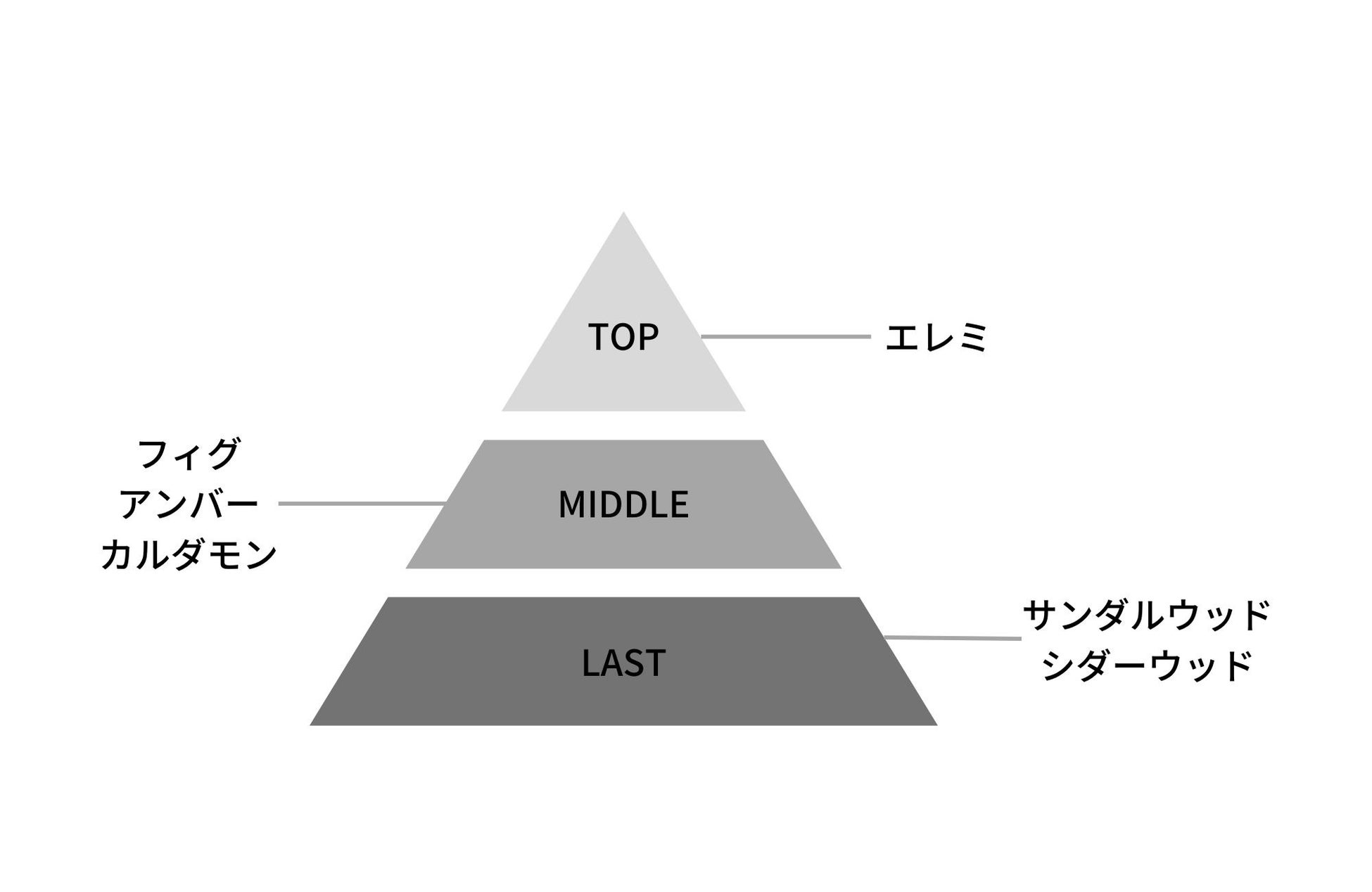 ミドルノートは、フィグ、アンバー、カルダモンなどのやわらかさが香り立ち、ラストノートはサンダルウッド、シダーウッドなど、エレガントな大人の香りとなります。