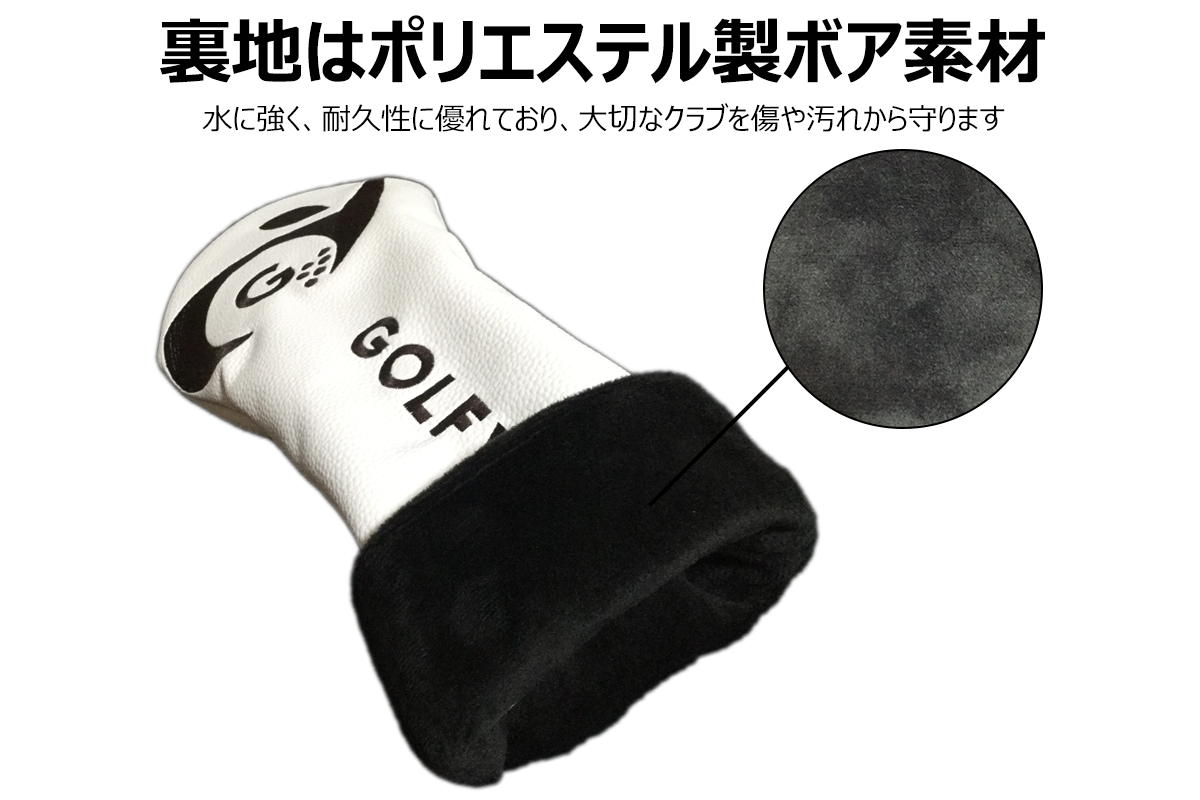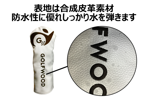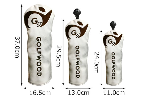 ゴルフクラブカバーは白色と茶色の2色展開。サイズは3種類で各サイズは下記画像の通りです。表地は合成皮革素材で防水性に優れしっかり水を弾き、裏地はポリエステル製ボア素材で水に強く耐久性に優れています。大切なクラブを傷や汚れから守る商品です。