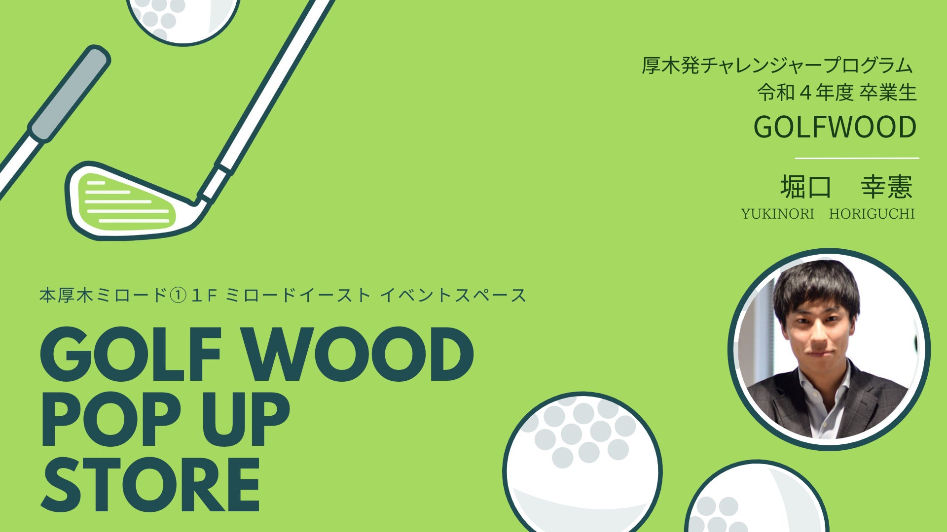 神奈川県から「令和4年度イノベーション人材交流拠点事業」を受託した、株式会社小田急SCディベロップメントと共同で県内の起業家創出に向けた取り組みを推進する活動の一環として、Agora Hon-atsugi では「厚木発チャレンジャープログラム」を実施。2022年8月より応募を開始し、同年10月に起業準備者=「チャレンジャー」8名が決定しました。その起業家の1人が「GOLF WOOD」の堀口氏です。「厚木発チャレンジャープログラム」では、約半年間、様々な伴走型の支援を実施。事業計画の作成や事業相談はもちろん、無料セミナー、ビジネスマッチング、専門家紹介、施設の期間中無償利用など、期間中に様々な支援を受けることが可能です。1期生の堀口氏は2023年3月に卒業しましたが、今年度は「AGORA Hon-atsugi チャレンジャー事業」と名前を変え、6月から募集を開始しています。