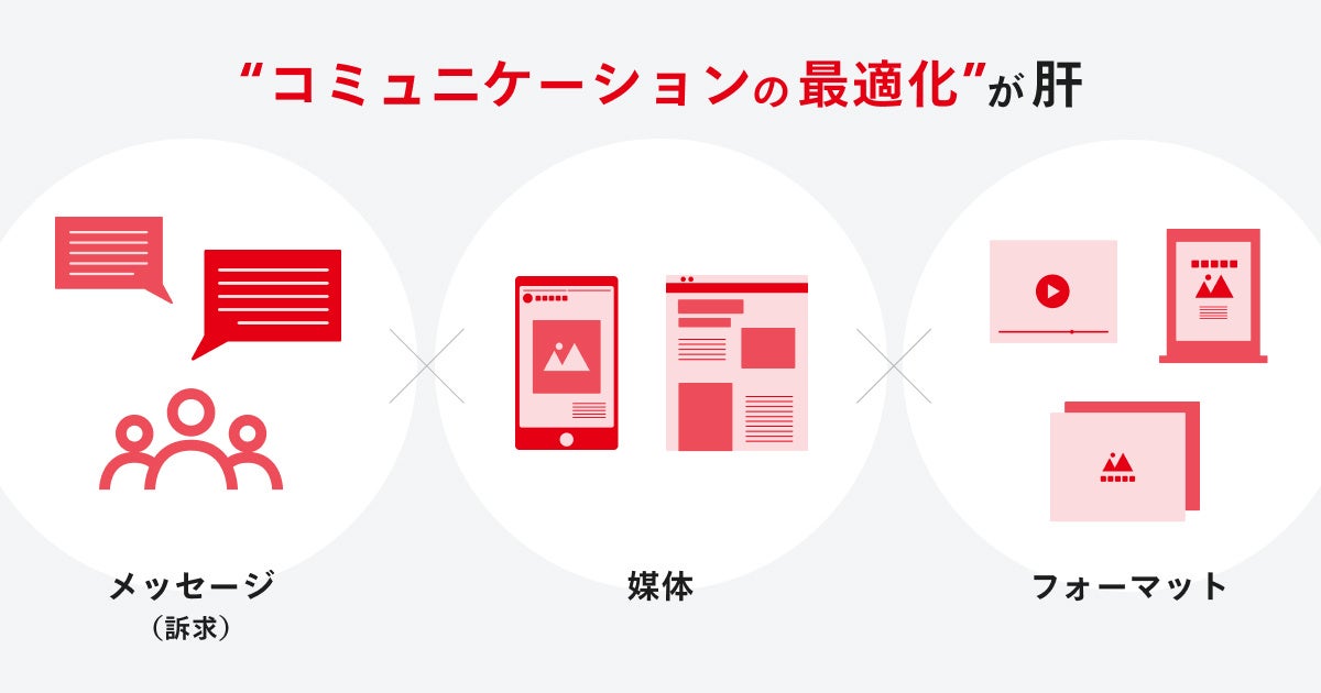 近年の生活様式・価値観の多様化や運用型広告のターゲティング自動化の流れにより、獲得向けデジタル広告においてクリエイティブが成果に寄与する度合いが大きくなっています。加えて、広告の配信先となる媒体や動画・静止画といった広告フォーマットが多岐にわたるため、どのような場合でも使えるクリエイティブの王道パターンは存在しません。「誰に何をどう伝えるか」というメッセージ×媒体×フォーマットの組み合わせ、つまり“コミュニケーションの最適化”が肝となります。