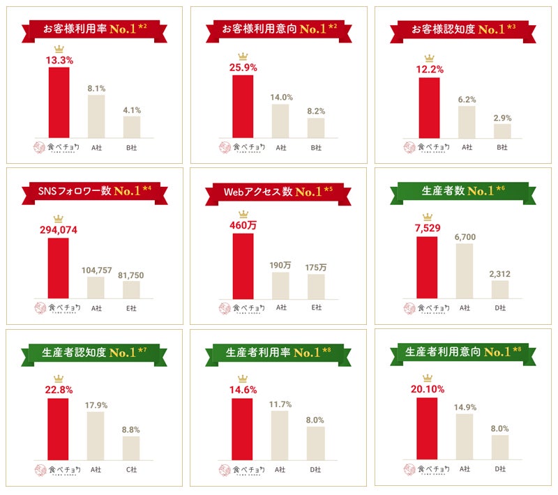 生産者・消費者の皆様に支えられ、登録生産者数は7600軒、ユーザー数70万人、利用率や認知度など9つのNo.1を獲得するなど、日本で最大の産直通販サイトに成長することができました。
