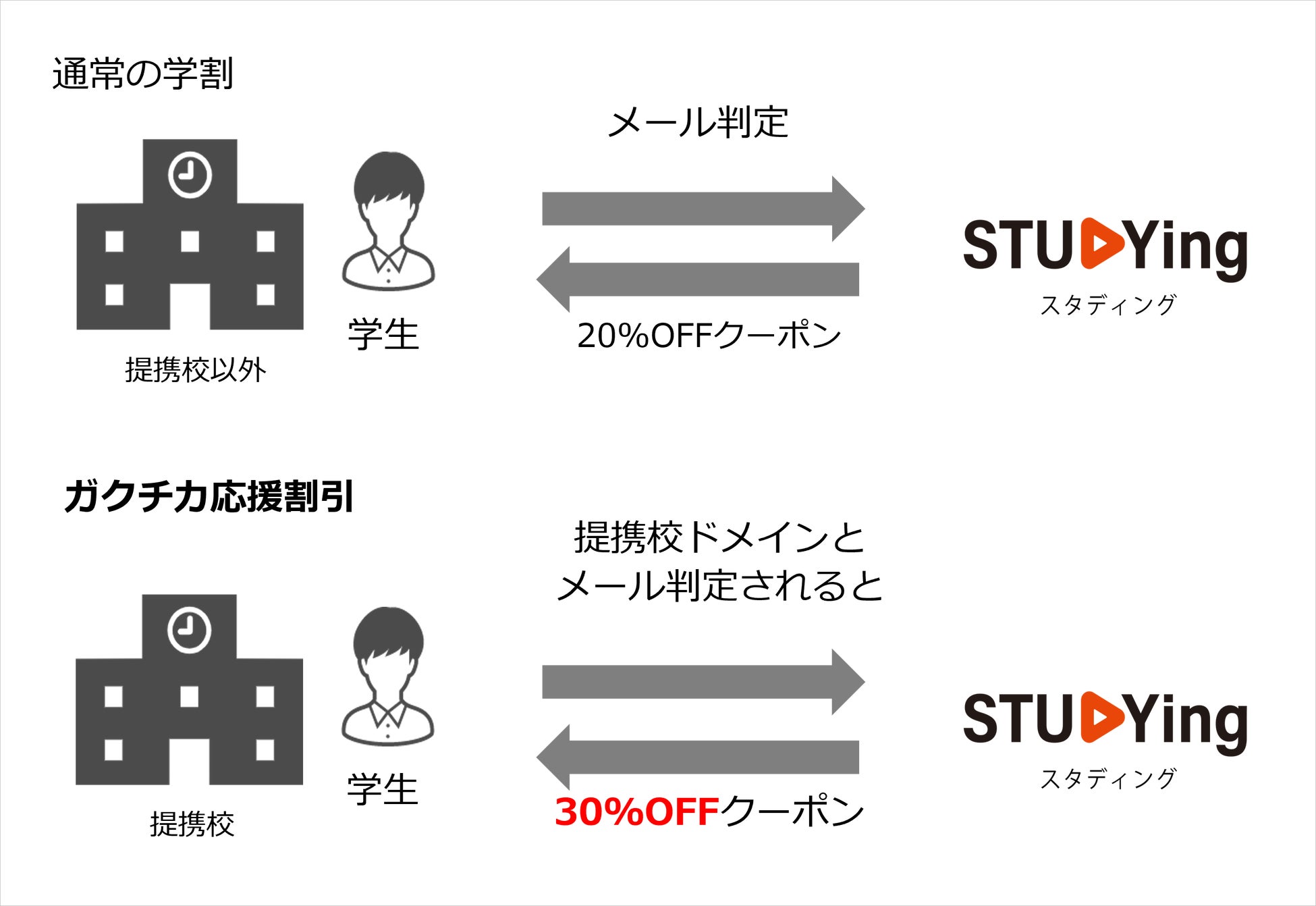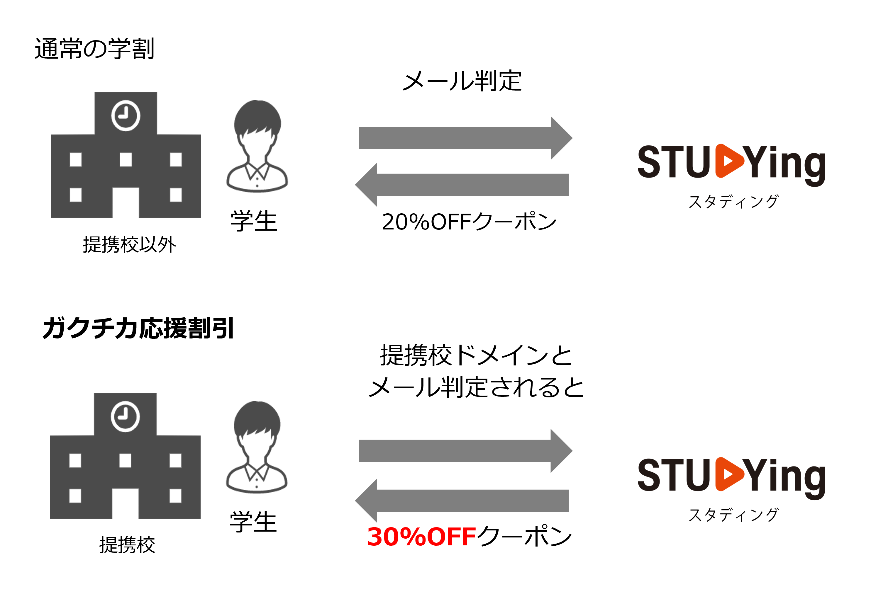 「ガクチカ応援割引」をご利用希望の学校様は、まずは下記のお問い合わせメールアドレスにご意向をお伝えください。メール受信後、当社より「STUDYingガクチカ応援割引」の告知物(ポスター・チラシ)を送付いたします。その際ご利用方法も合わせてお伝えさせていただきます。提携後は、御校の学生様が御校ご発行のメールアドレスを用いて当社WEBサイトにてスタディングの講座をお申し込みされると提携の有無を自動的に認証し「ガクチカ応援割引」が適用されます。学校様側で提携後に必要な手続きなどはございません。