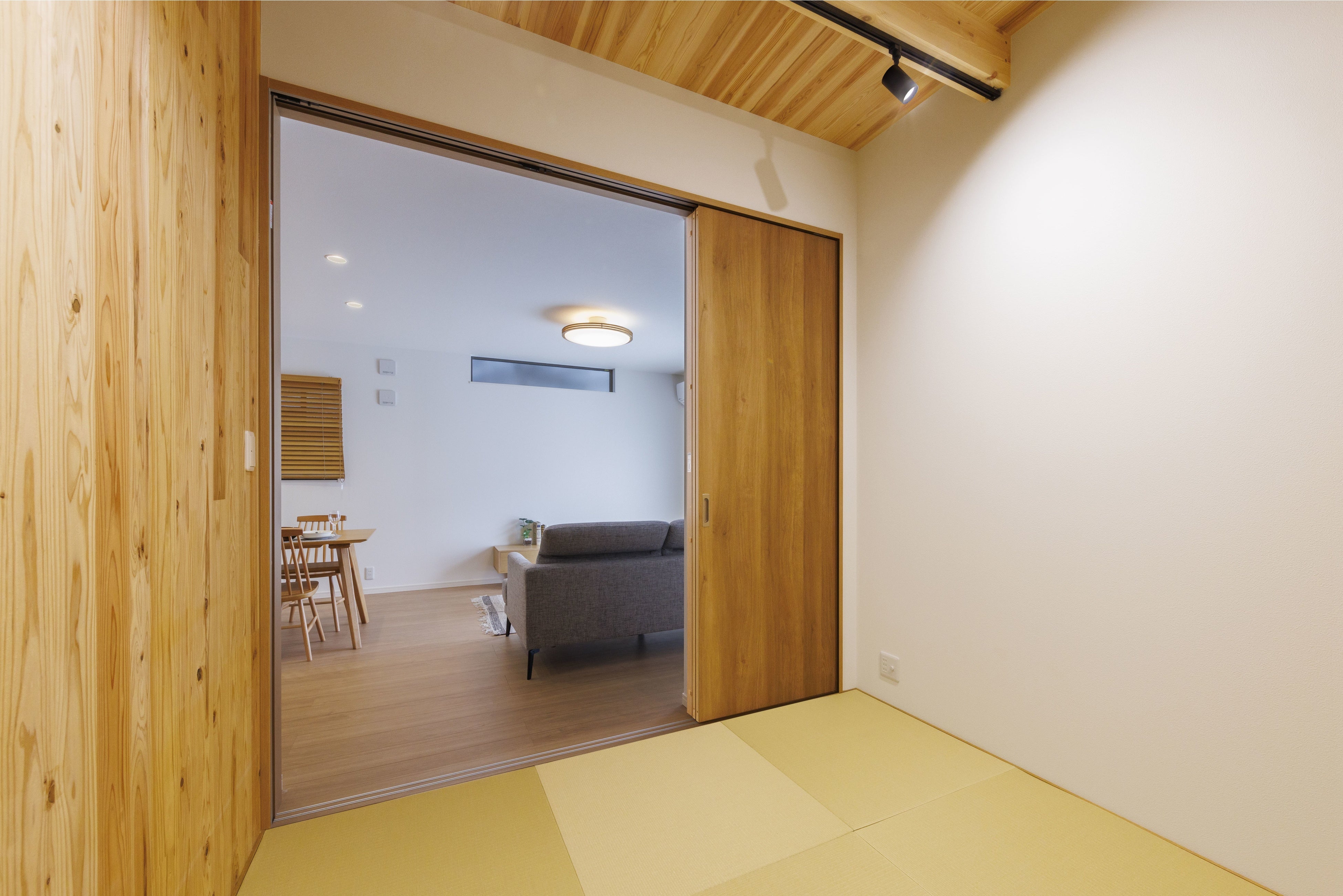 CLTパネルをそのまま見せる『現し仕上げ』が可能で、木目や節や木肌の色合い、木の香りを五感で味わうことが出来るのが魅力です。(写真上:越来②号地分譲 リビングダイニング 下:越来③号地分譲 和室)