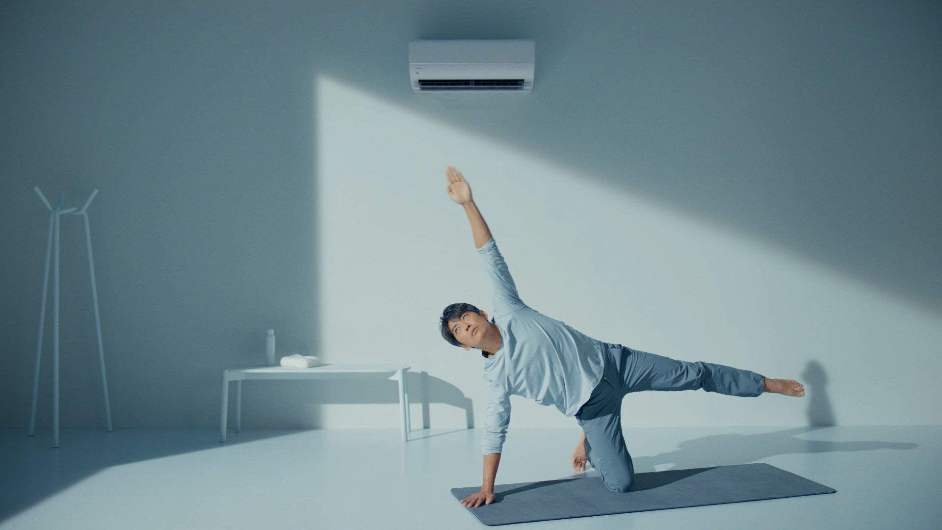 リビングでマットを広げて、ピラティスをしようとしている反町さんが「エアコンは、どこまで空気をキレイにできるか。」と投げかけ。エアコン「大清快」のプラズマ空清を紹介します。
