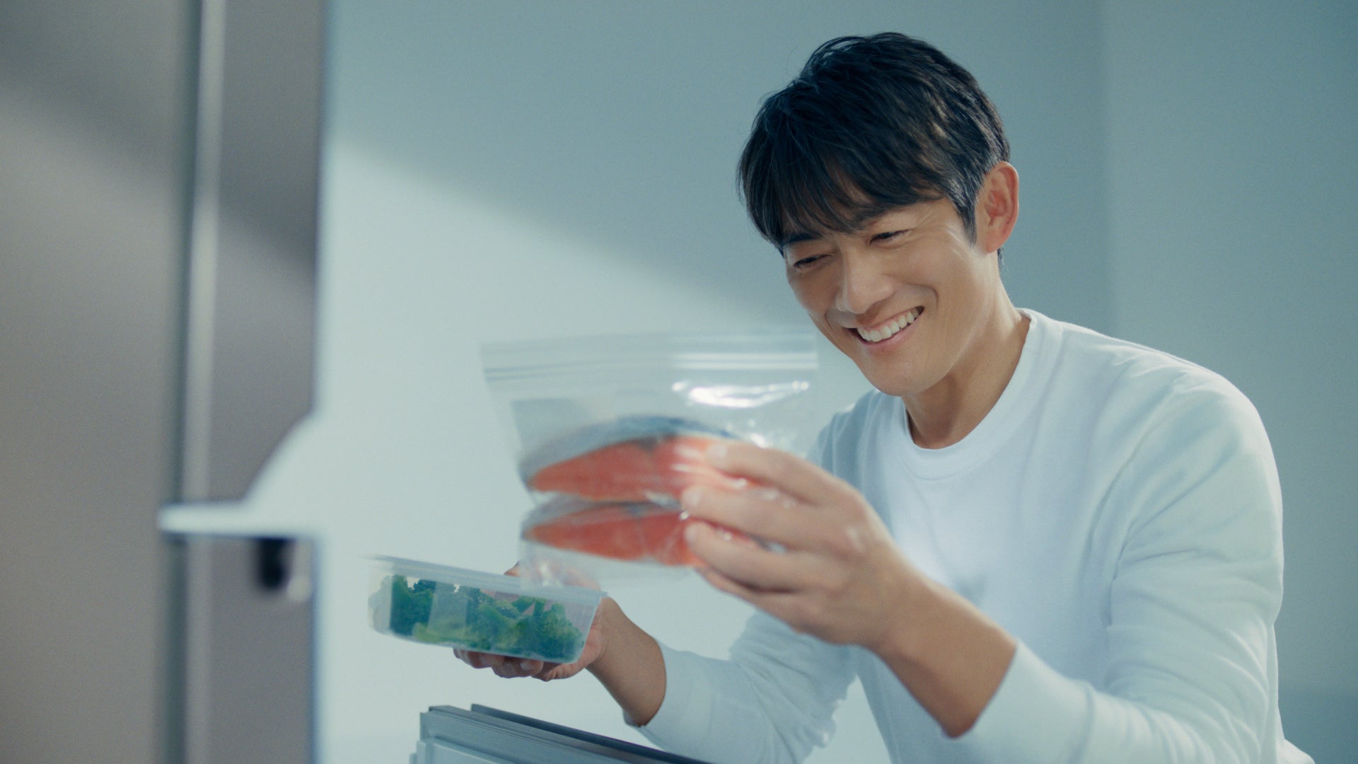 ふるさと納税の返礼品のお肉や作り置きのおかずなど、冷凍したいものはたくさんあるなと感じる反町さん。冷蔵庫「VEGETA」の3段冷凍室は、たっぷり大容量なのに整理しやすく使いやすいところが特長です。反町さんは、冷凍室の中からおかずを取り出し、その使いやすさを実感しています。