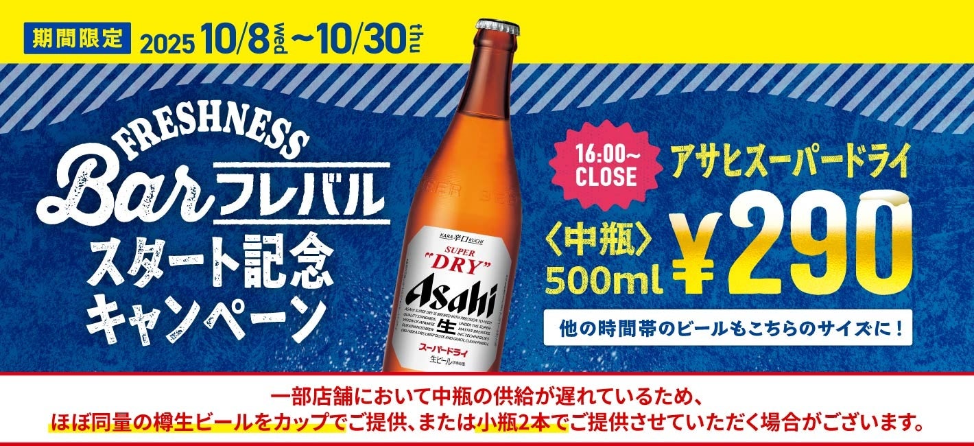 \「フレバル」スタート記念キャンペーン/16時~アサヒスーパードライ〈中瓶500ml〉が290円!通常の単品・セットビールも〈中瓶〉で満足度アップ!