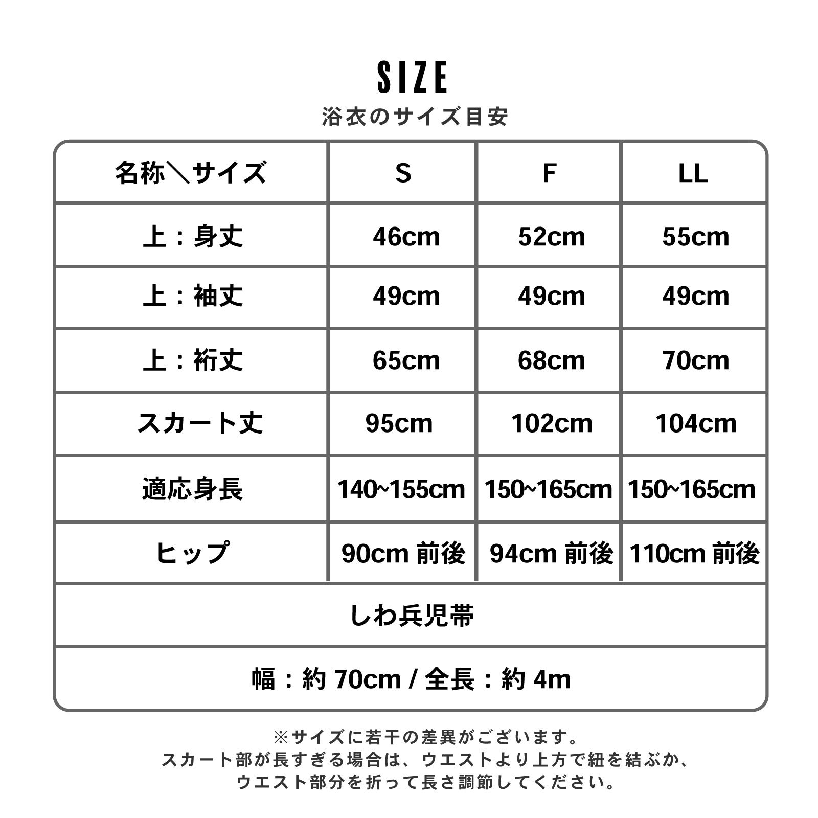 お客様からのご要望にお応えし、今年からS・F(フリー)・LLの3サイズをご用意いたしました。ご自身の身長や体型に合わせて最適なサイズをお選びいただけるため、二部式浴衣にありがちな「サイズが合わず野暮ったく見える」という問題を解消し、より自然で本格的な着姿を実現します。