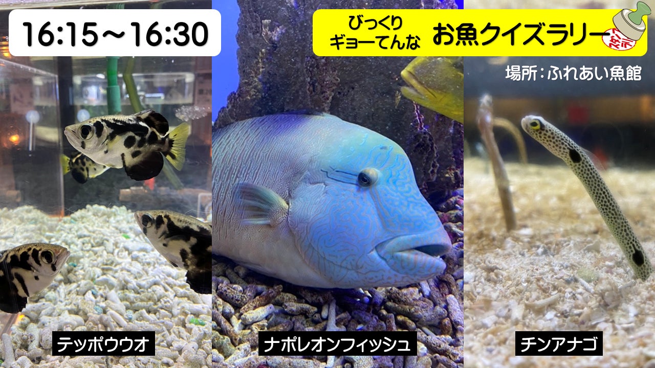 ※16:15~16:30の間に各展示水槽(テッポウウオ・ナポレオンフィッシュ・チンアナゴ)前にいるお魚スタッフにお声掛けください。