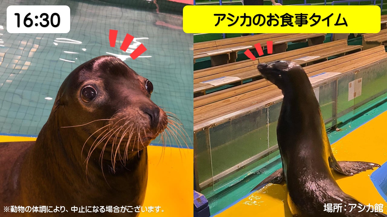 アシカたちのトレーニング風景やお食事するところをご覧いただけます。