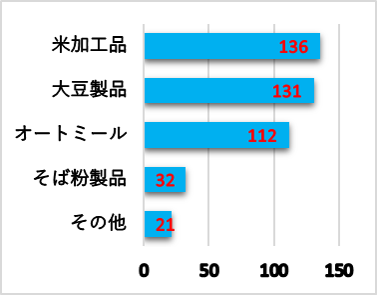 また、「どのようなグルテンフリー商品を食生活に取り入れているか」への回答は、右図の通り、グルテンフリー食品の中では米粉製品が最も多いことがわかりました。
