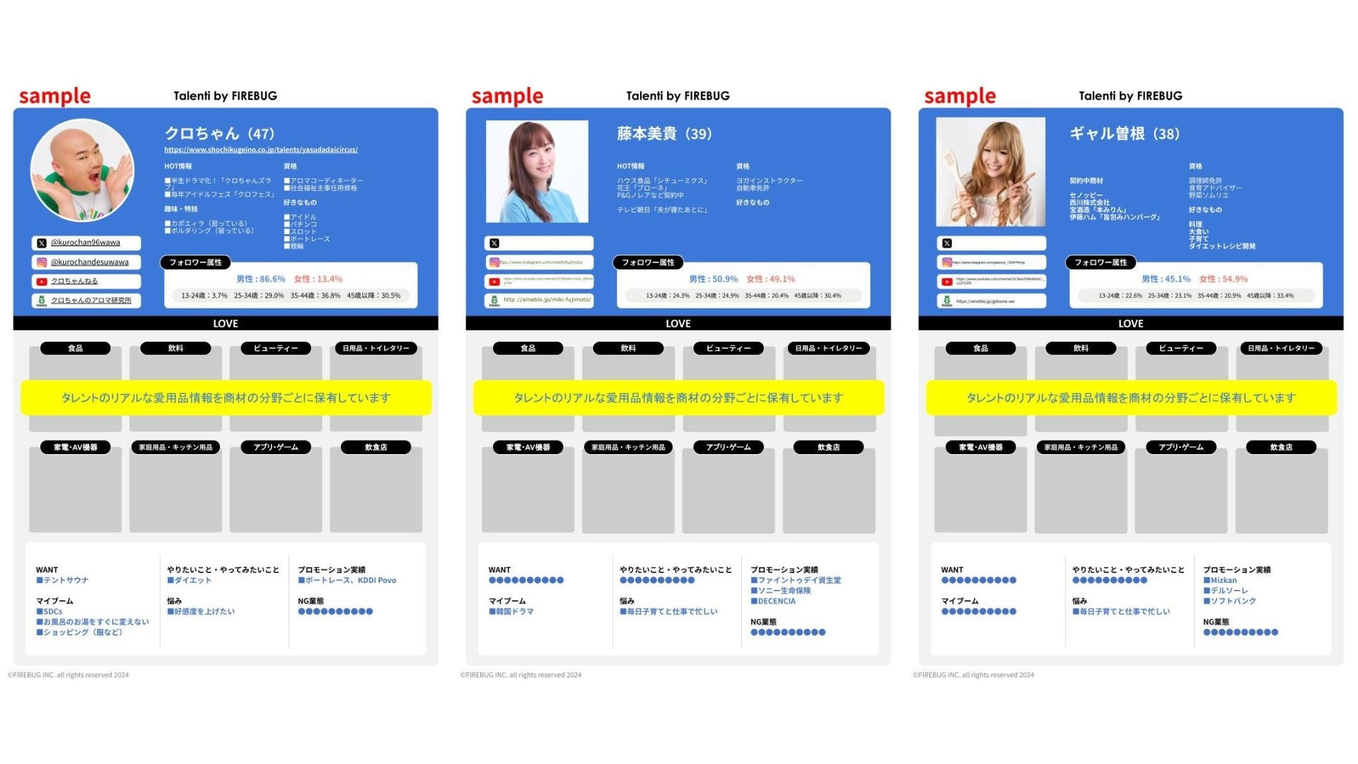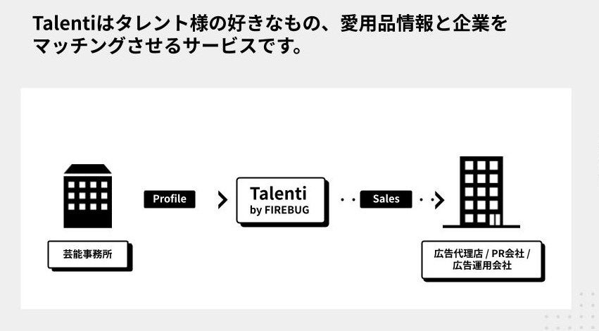 FIREBUGは、広告主による商品や周辺ジャンルに興味があるタレント・インフルエンサーを起用したい、一緒に企画をつくりたいといったニーズに加え、コンテンツに接触するファンを楽しませ、商品やサービスのファンになるような企画をサポートすべく、100社を超えるタレント・インフルエンサー事務所とのリレーションをもとに「Talenti」のデータベースを拡充してきています。このたび、起用を検討している企業とタレントやインフルエンサーを愛用品情報でつなぐための愛用品登録者数が3,000名を突破し、「Talenti」を正式スタートします。