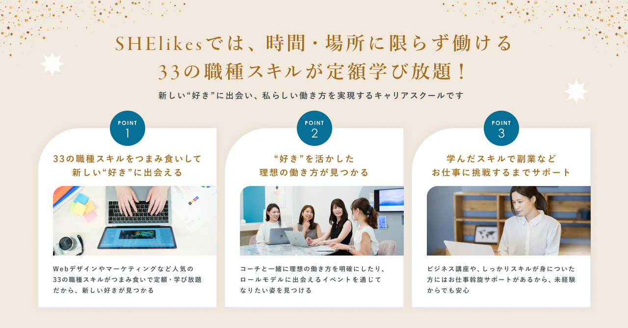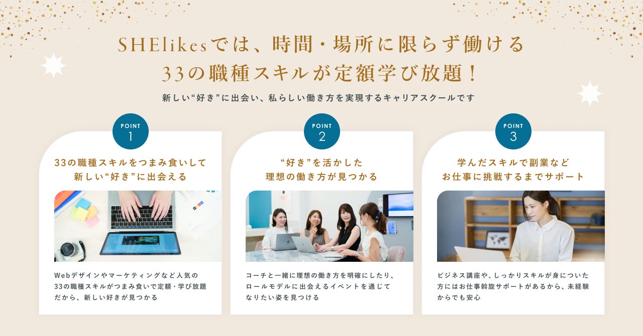 SHElikesは、Webデザイン・Webマーケティング・ライティングなどPC一つで働ける33種の職種スキルを幅広く学び、今の時代に求められるマルチクリエイターを育成して、時間や場所に縛られない賢く私らしい働き方を実現するためのキャリアスクールです。