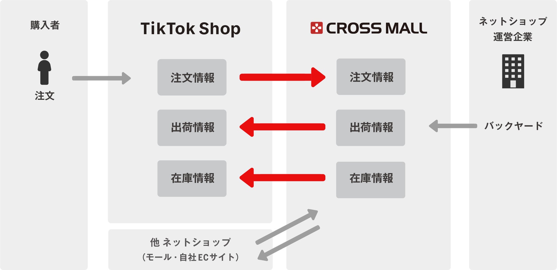 このたびの連携により、すでに「TikTok Shop」に出店されており、複数のネットショップを展開している企業さまは、「CROSS MALL」で注文情報の一元管理が可能になります。