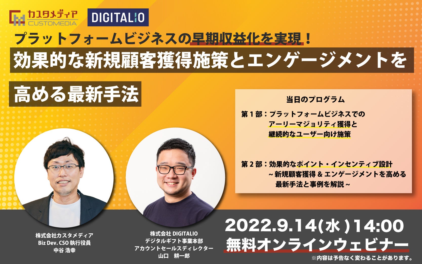 株式会社カスタメディア(本社:兵庫県神戸市 代表取締役:宮﨑耕史)は、来る2022年9月14日(水)、株式会社DIGITALIO様と共催で『プラットフォームビジネスの早期収益化を実現! 効果的な新規顧客獲得施策とエンゲージメントを高める最新手法』を無料で開催いたします。
