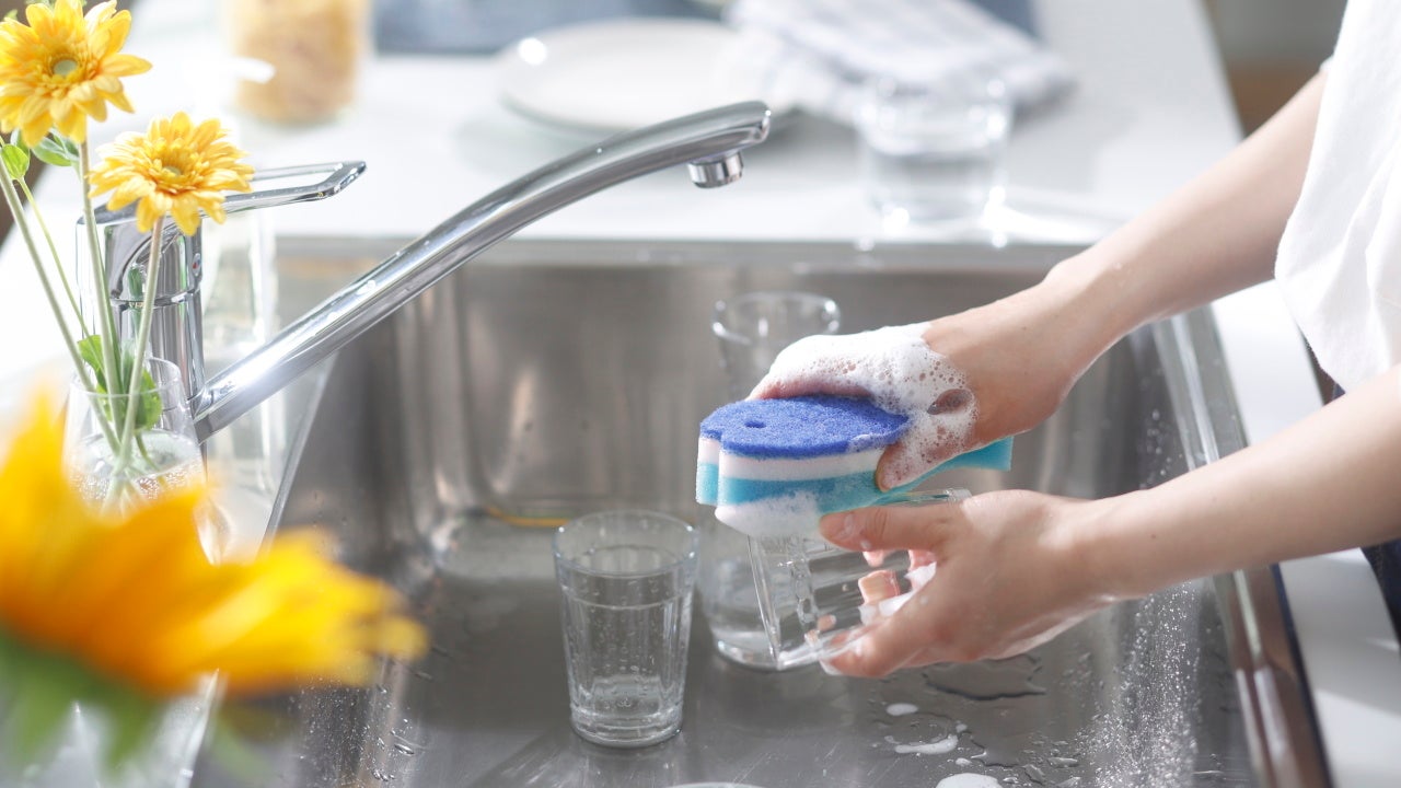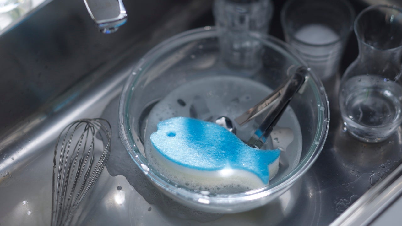 「おさかなスポンジ」はおさかなの形が手になじみ、握りやすいキッチンスポンジです。長めのサイズでコップの底まで届きます。ナイロン不織布・ウレタン・脱膜ウレタンの3層構造で、汚れ落ち、泡立ち・泡持ち、水切れにも優れています。「かわいいだけじゃなく使いやすい」と長くお客様に支持をいただき、発売から25周年を迎えました。