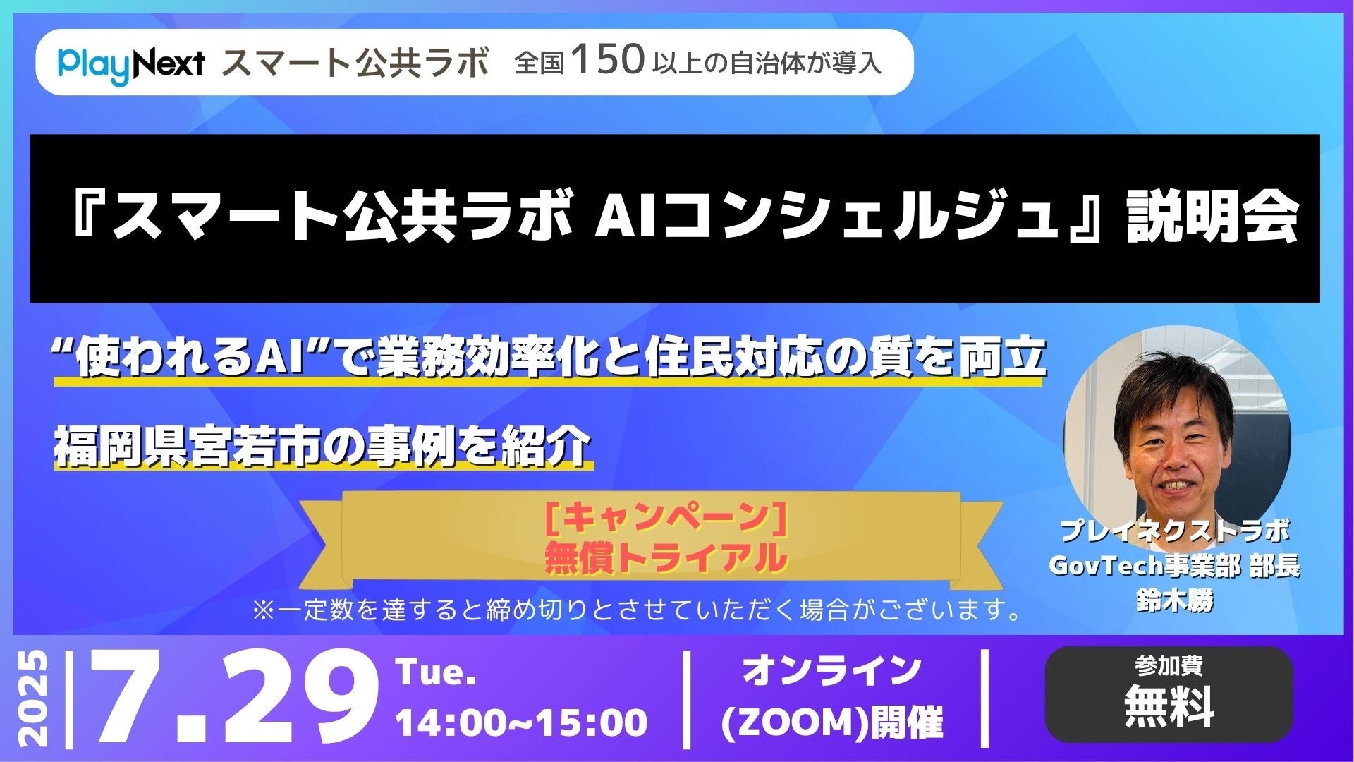 プレイネクストラボ株式会社(本社:東京都品川区、代表取締役:柏 匠)は、 全国150以上の自治体が導入するLINEではじめる自治体のデジタル総合窓口「スマート公共ラボ」の新シリーズとして、生成AIを活用した「スマート公共ラボ AIコンシェルジュ」の提供を、全国の地方自治体向けに開始いたします。また、スマート公共ラボ AIコンシェルジュの説明会を7月29日に参加費無料でオンライン開催いたします。