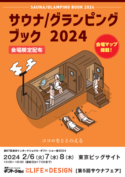 会場ではサウナの最新トレンドやグッズを記載した「サウナ/グランピングブック2024」(A5判型、カラー)を無料配布します。全出展社を網羅した会場マップ、注目の出展社インタビュー、コクヨ株式会社や株式会社伊藤園の新規サウナ事業の取り組みなどを掲載!会場をまわる際に必携のミニブックとなります。