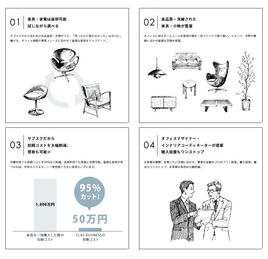 オフィス回帰が進む一方、リモートワークもニューノーマルな働き方として普及し、出社とリモートワークを組み合わせた「ハイブリットワーク」が浸透する中、「CLAS BUSINESS」の「返すことができる」家具なら、自由にオフィス環境や不動産物件などのアップデートができます。