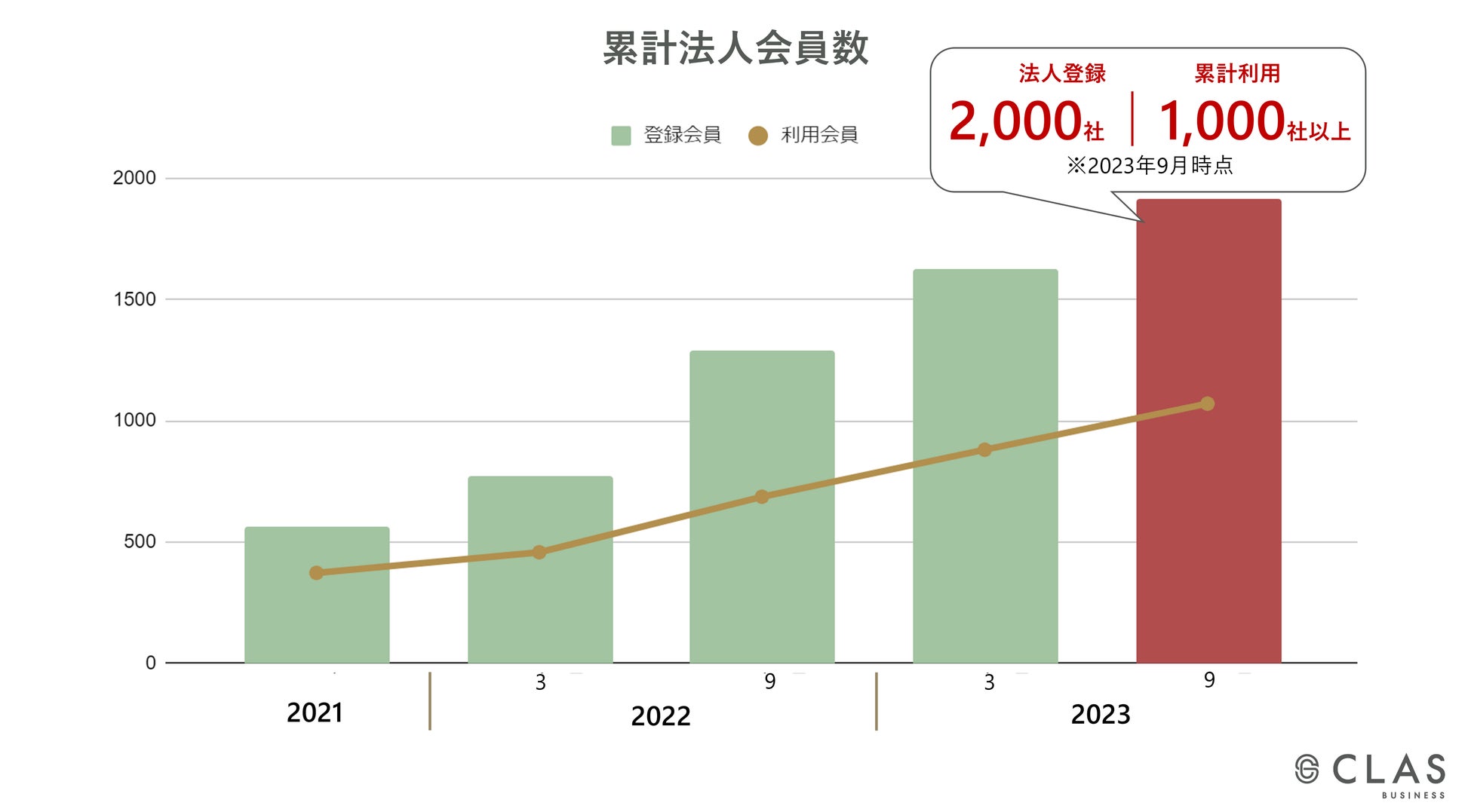 事業成長の推進に貢献すると同時に、資源を循環させる「サーキュラーエコノミー(循環経済/循環型経済)」を実現し、サステナブルな経営を後押しすることから、「CLAS BUSINESS」は登録数2,000社、累計1,000社以上の法人様にご利用いただいております。(2023年9月時点)