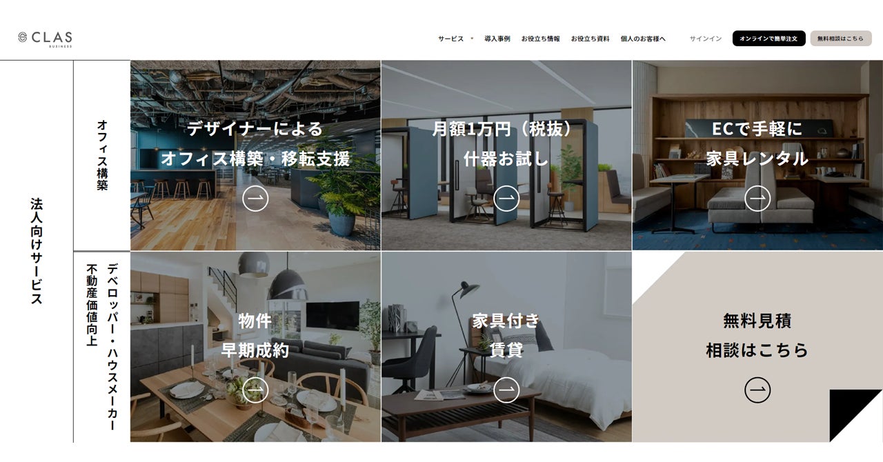 執務スペースやフリースペース刷新、オフィスの音問題対処、不動産物件の早期成約など、課題に合わせたサービスをよりわかりやすくご提案し、お客さまのご要望に空間づくりでお応えするため、このたび「CLAS BUSINESS」のサイトをより使いやすくリニューアルいたしました。