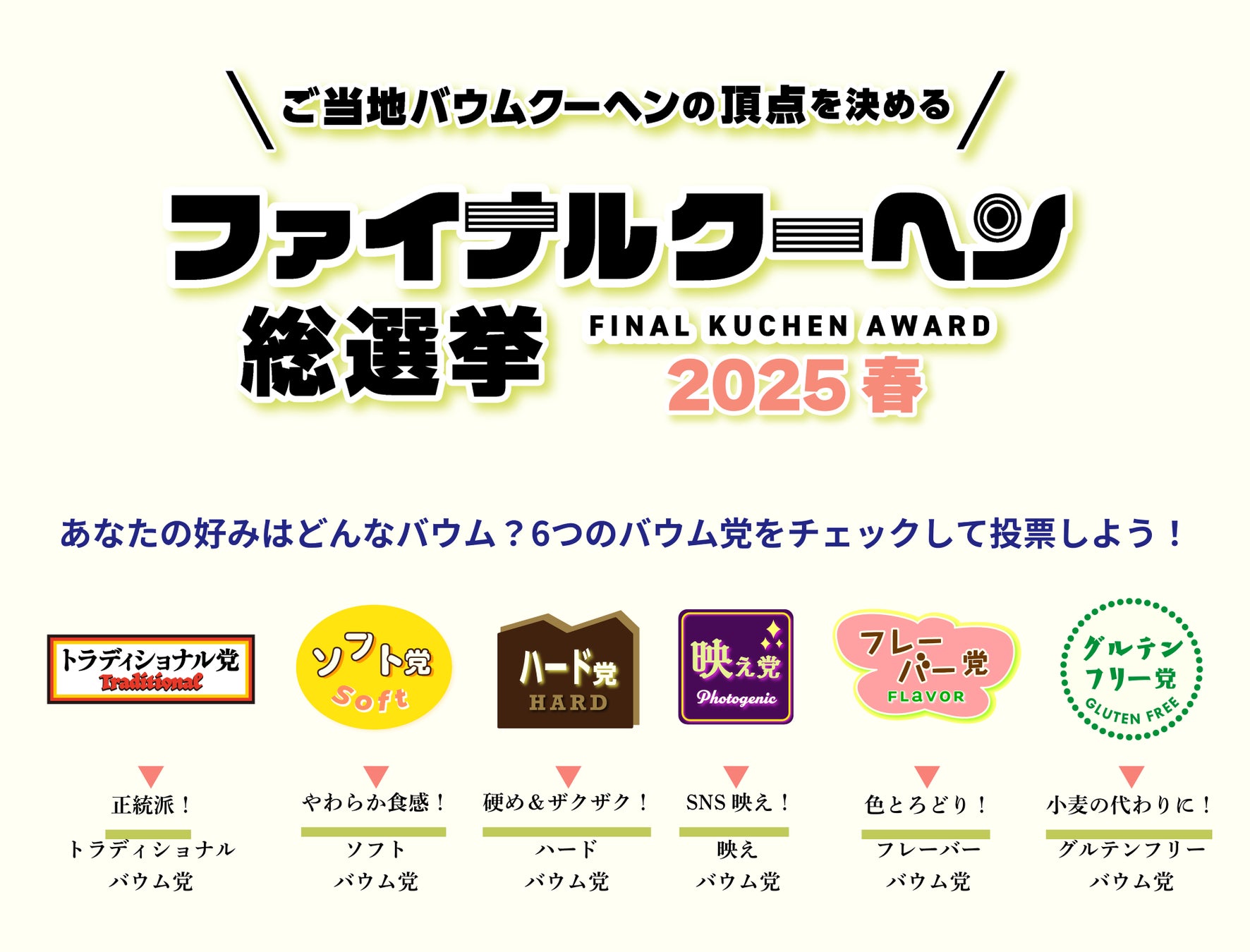 今回は25ブランドが選りすぐりのバウムクーヘンを持ち寄り総選挙へ立候補。Instagram投票も実施されるため、開催期間中は日本全国どこからでも投票が可能です。みなさまの清き1票をご当地ブランドが心待ちにしています。あなたの推しのご当地バウムクーヘンに投票して、推しバウムを応援しましょう!