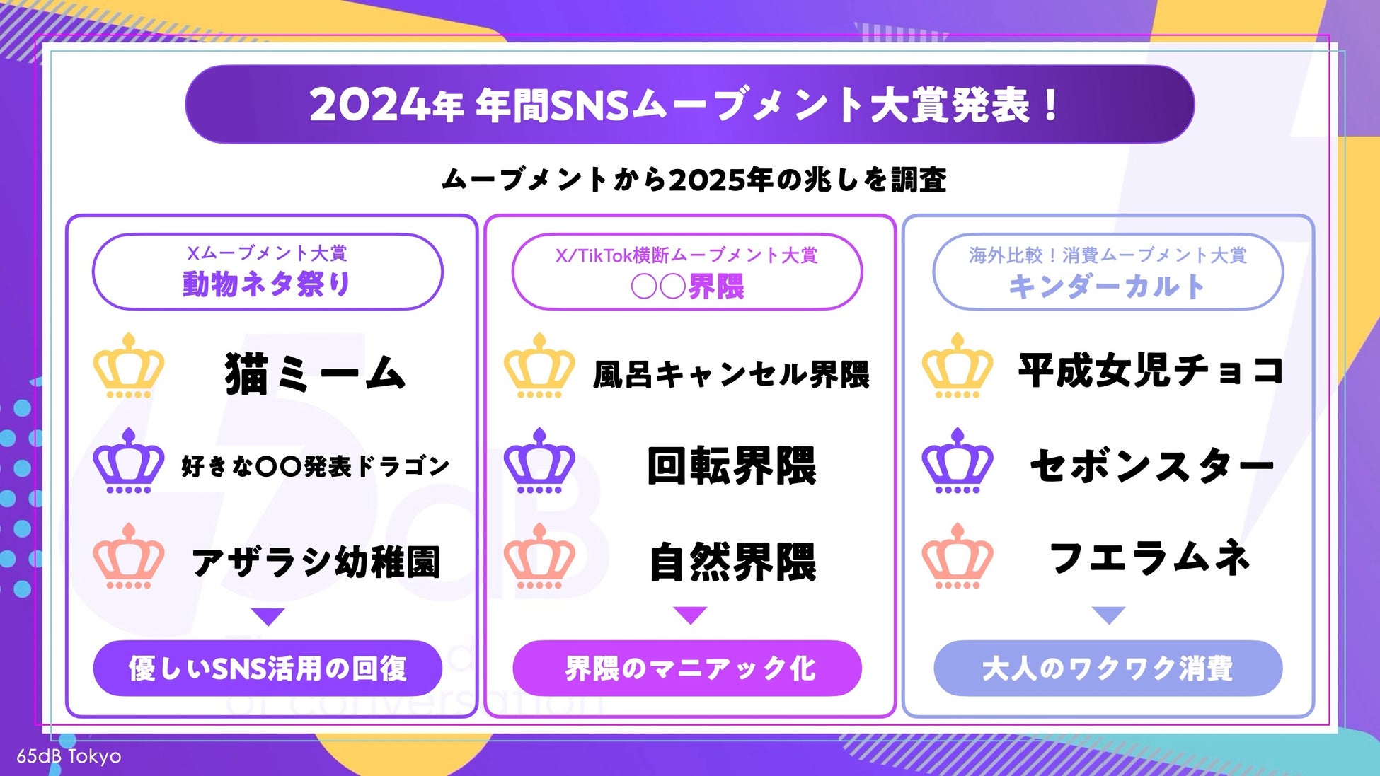 2024年も残すところあとわずかとなった今、日々SNSをウォッチしている「65dB TOKYO」が今年のSNSで盛り上がりを見せたムーブメントを以下の3つの視点から振り返り、大賞を決定しました。