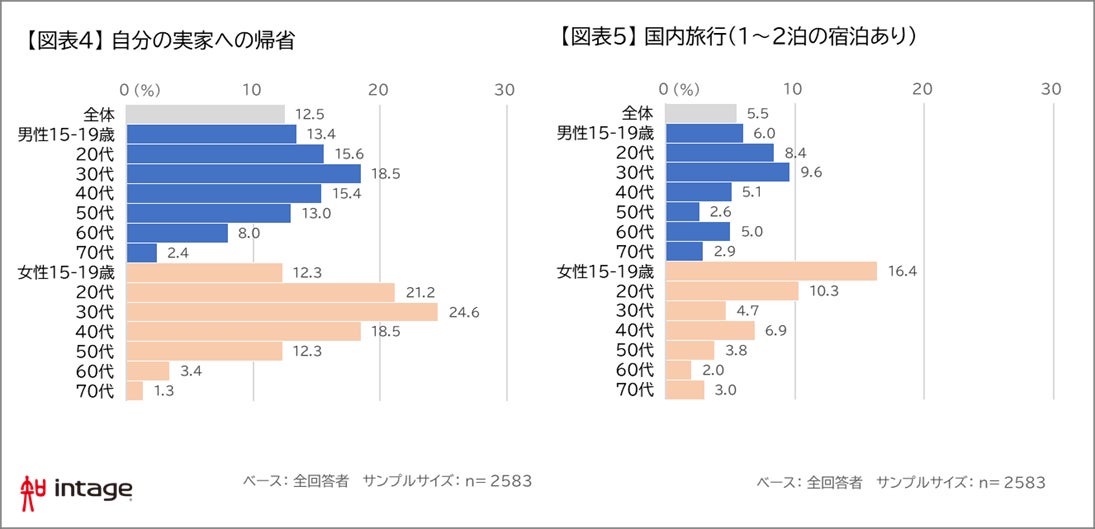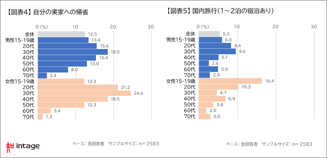 「1~2泊の国内旅行」予定者を性・年代別にみると、女性10~20代といった若年層で10%を超え、男性も若年層の方が高い傾向がみられ、比較的短い日程の国内旅行が若年層に支持されていることが浮き彫りになった。【図表5】