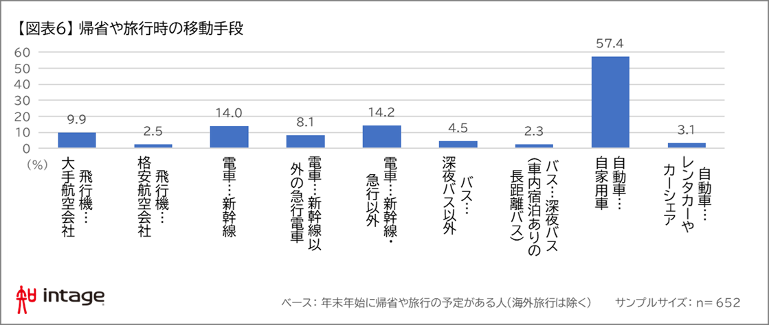 移動手段については「自家用車」が6割弱を占める結果になった。一方で「レンタカーやカーシェア」は3%とわずかに留まっており、街中の駐車場などでカーシェアのサービスを見かけるようになったものの依然として「自家用車」が多いことがわかった。電車での移動については、「新幹線・急行以外(14%)」、「新幹線(14%)」、「新幹線以外の急行(8%)」となっていた。また、飛行機による移動については「大手航空会社」が10%、「格安航空会社」は3%となっており、大手航空会社の利用予定が多くなっていた。【図表6】