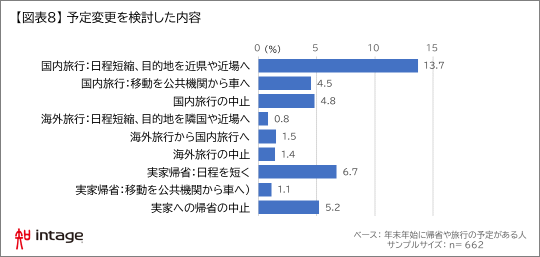 「変更を検討した(31%)」人に変更内容を質問したところ、国内旅行を予定している人は「日程短縮、目的地を近県や近場へ(14%)」が最も多くなっていた。また、「公共の交通機関から車へ(5%)」という形で混雑を避ける目的からか電車などから自動車への変更を検討している人も確認された。実家への帰省を予定している人では、「日程を短く」した人も7%ほどみられた。一方で、「国内旅行の中止(5%)」、「実家への帰省の中止(5%)」という形で、イベントそのものの中止を検討している人が一定数いることがわかった。【図表8】