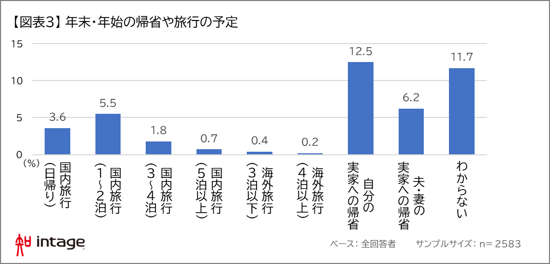 - 年末・年始、帰省や旅行の予定者は4人に1人。予定としては「自分の実家への帰省(13%)」が最も多く、「夫・妻の実家への帰省(6%)」「1~2泊の国内旅行(6%)」が続く。海外旅行予定者は少なかった。