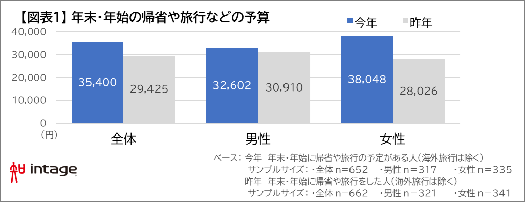 年末・年始の帰省や国内旅行にかけるお金は平均35,400円(昨年の1.2倍) 女性の予算は35%増、男性は5%増と大きな差。若年女性の国内旅行が増加