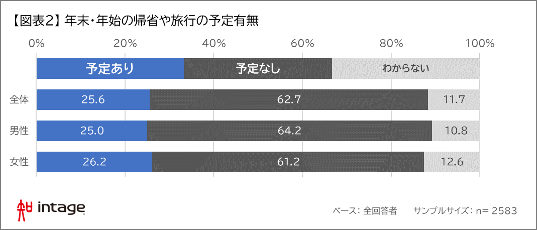 年末・年始の予定の有無を聞いたところ、約4人に1人(26%)が年末・年始に帰省や旅行を計画していた。【図表2】