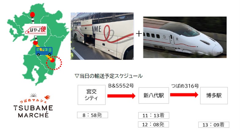 このたびの新たな物流ルート開拓における実証実験においては、いちごが、みやざきサンクスマーケットで選定した宮崎県の逸品を、宮交シティから新八代駅までJR九州バス(B&Sみやざき)、新八代駅から博多駅までを九州新幹線(つばめ316号)というルートで即日配送し、博多駅にある「つばめマルシェ@博多」で販売いたしました。積載時および販売までの所要時間をはじめ、積載方法や振動状況の確認、ニーズの調査などを検証してまいります。