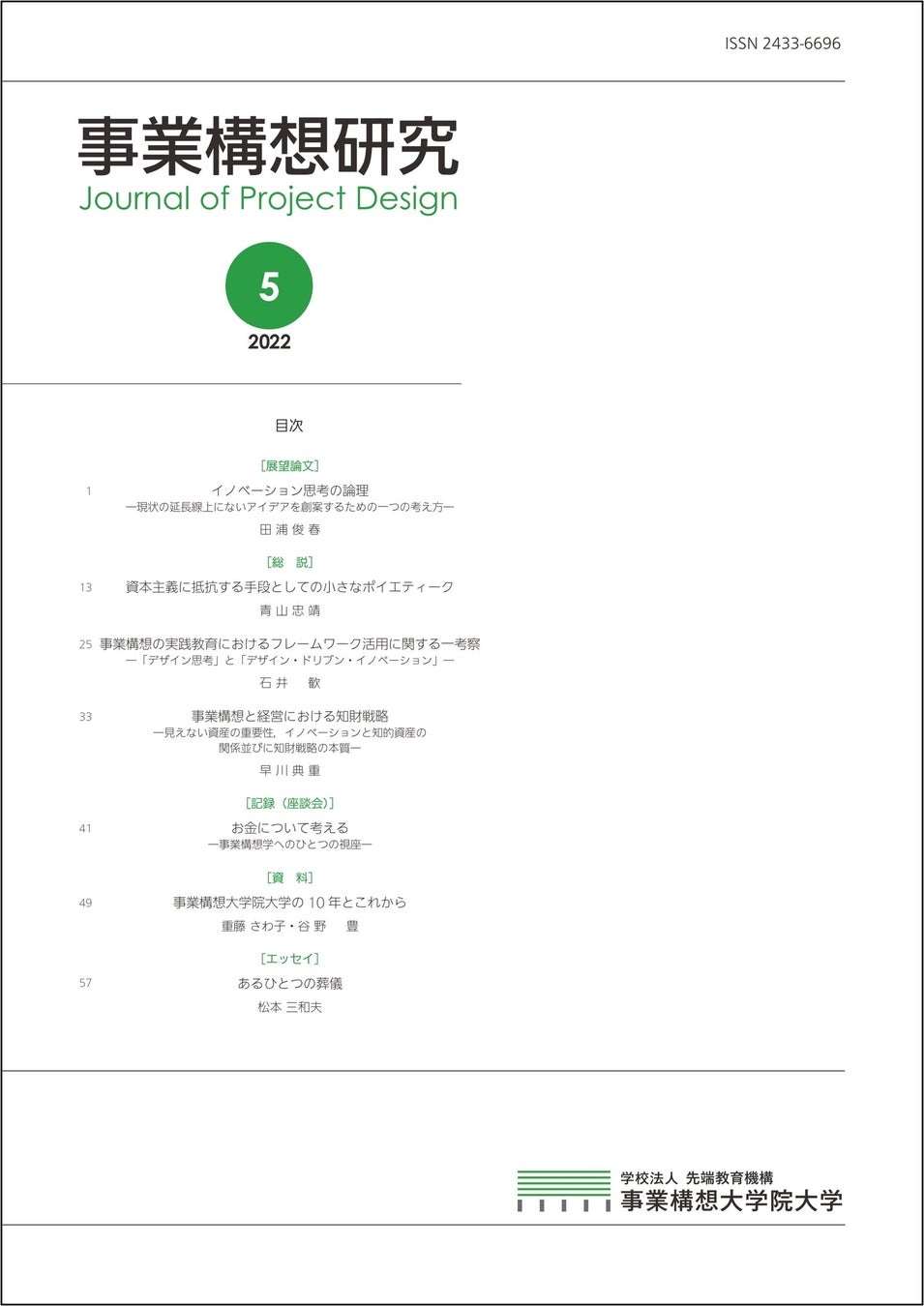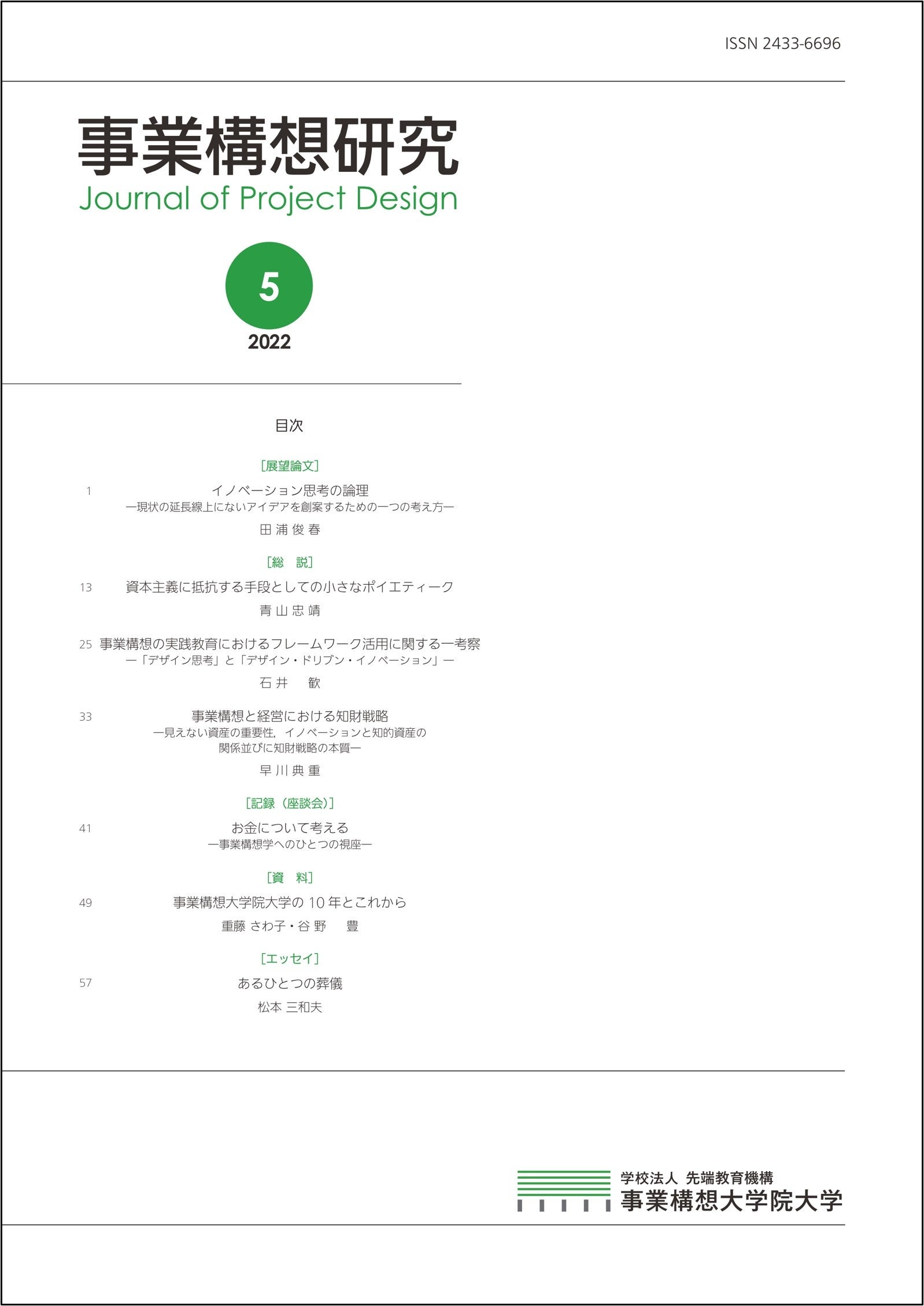 事業構想大学院大学(学校法人先端教育機構、本部:東京都港区、学長:田中里沙)は、学術誌「事業構想研究」第5号を発刊しました。本誌は本学教員の論文等が掲載され、学校法人機関リポジトリでも公開しています。