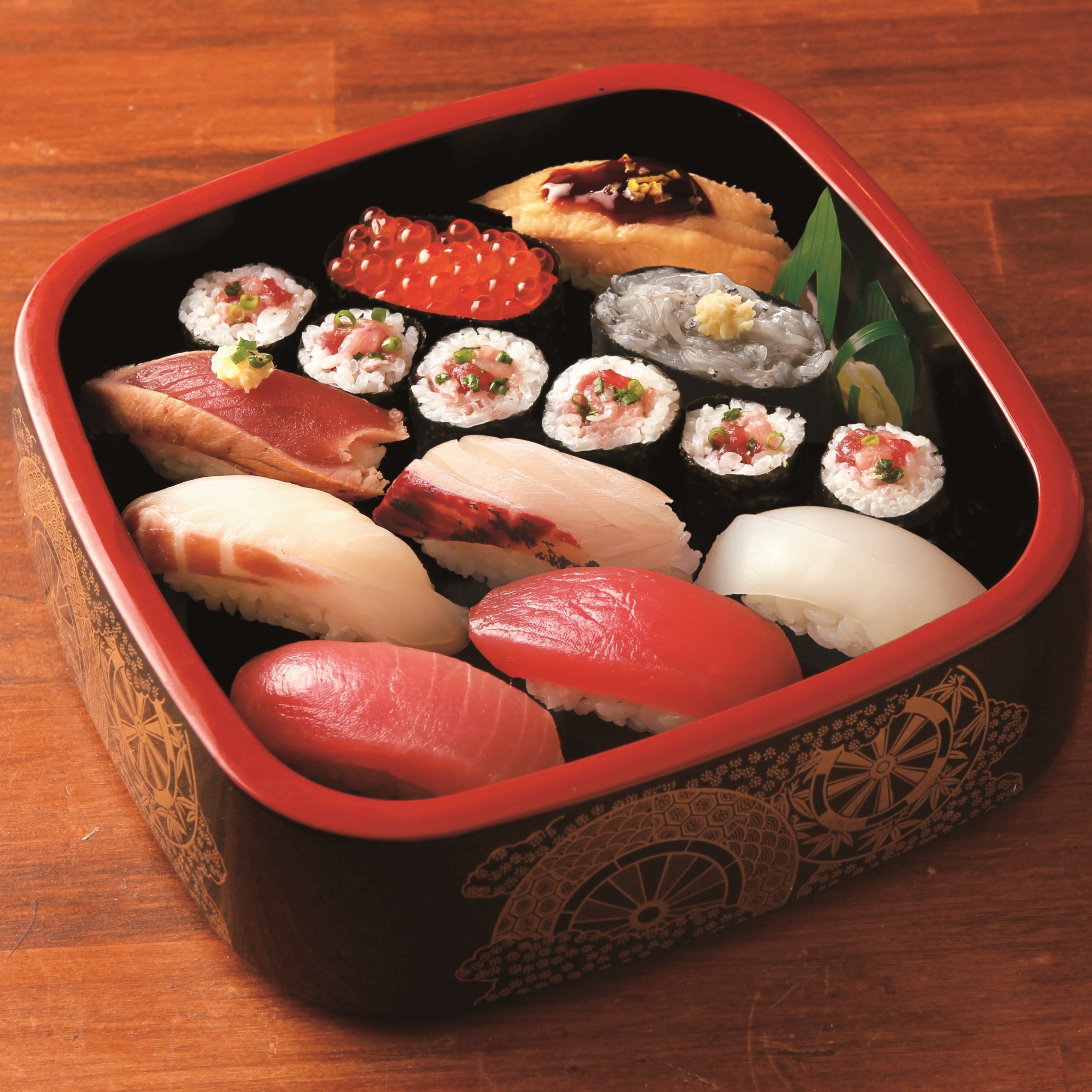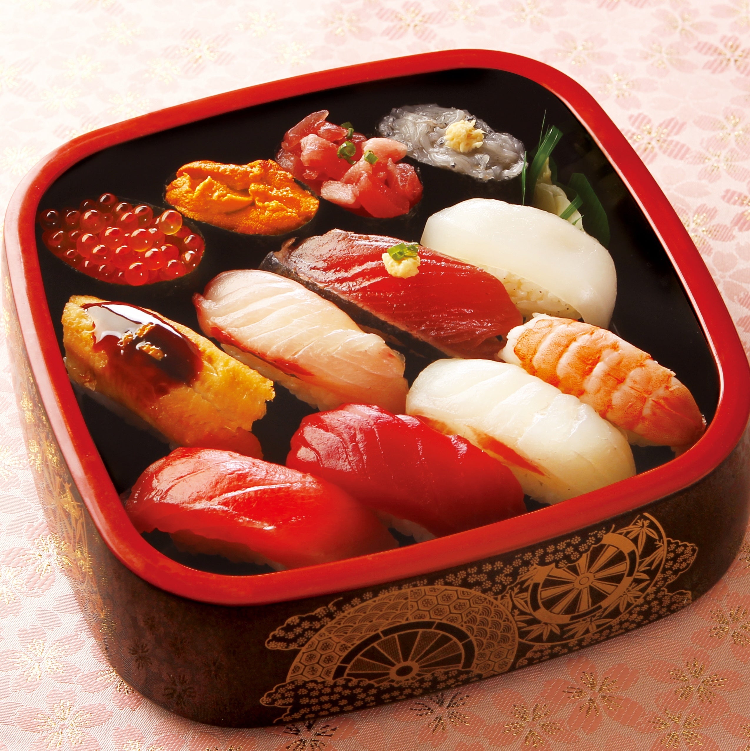 【商品内容】 春の旬ネタ5貫(真鯛、しまあじ、鰹のたたき、生しらす、紋甲いか)、中とろ、まぐろ赤身、生うに、いくら、落ちとろ、柚子ふり穴子、海老