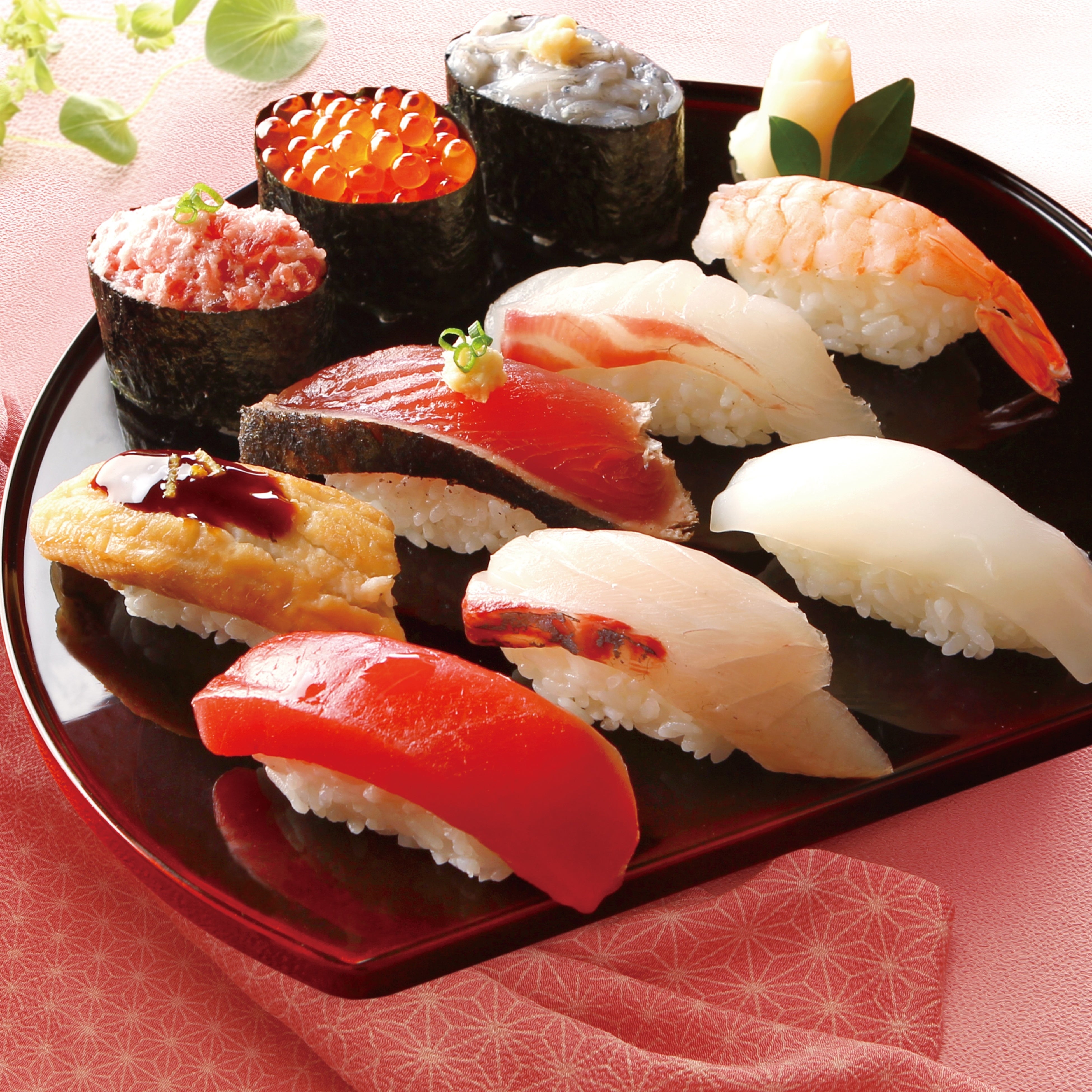 【商品内容】 春の旬ネタ5貫(真鯛、しまあじ、鰹のたたき、生しらす、紋甲いか)、中とろ、まぐろ赤身、いくら、ねぎとろ巻き、柚子ふり穴子