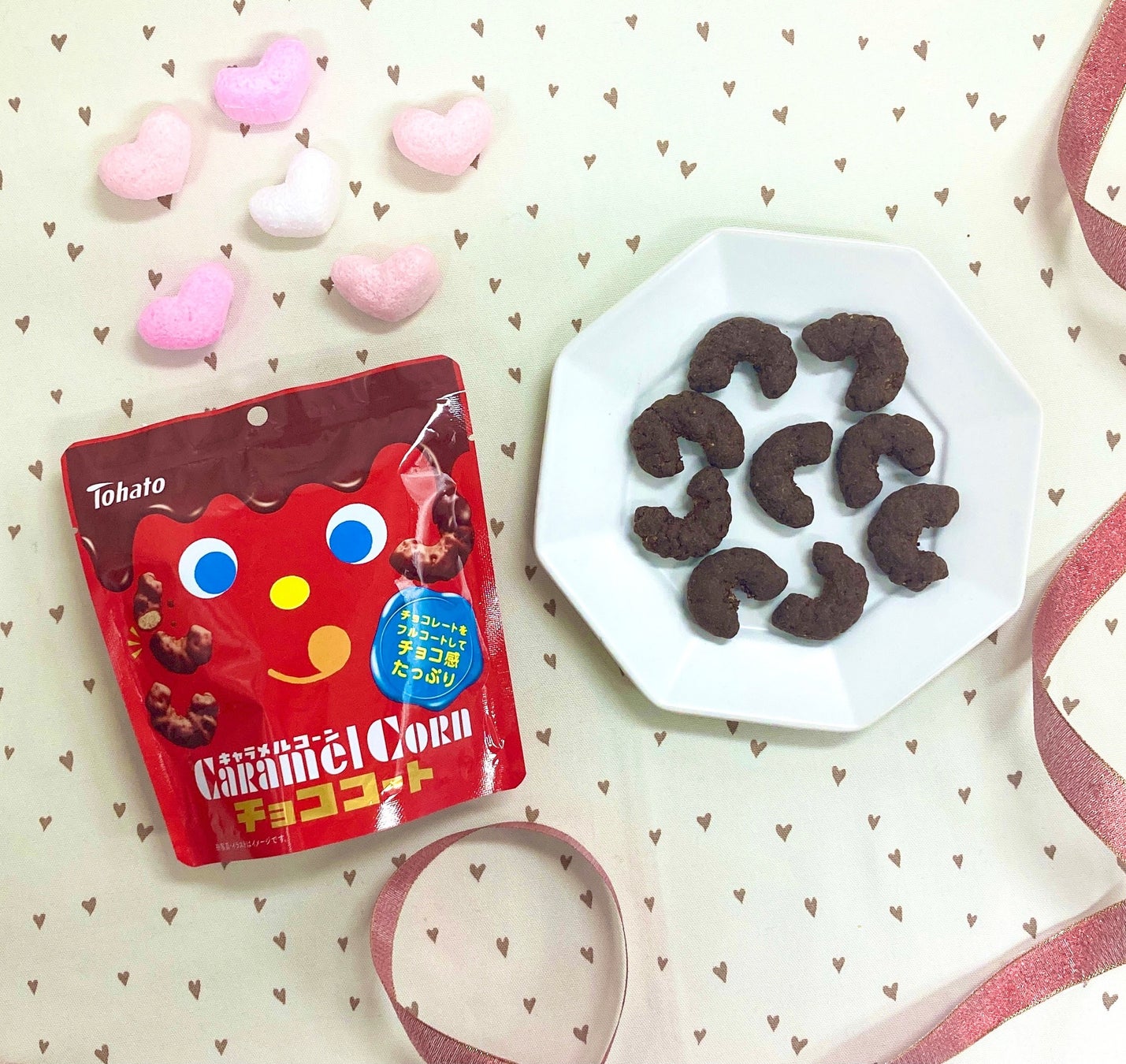商品特徴:東ハトで人気の「キャラメルコーン」をチョコレートでコーティングしました。