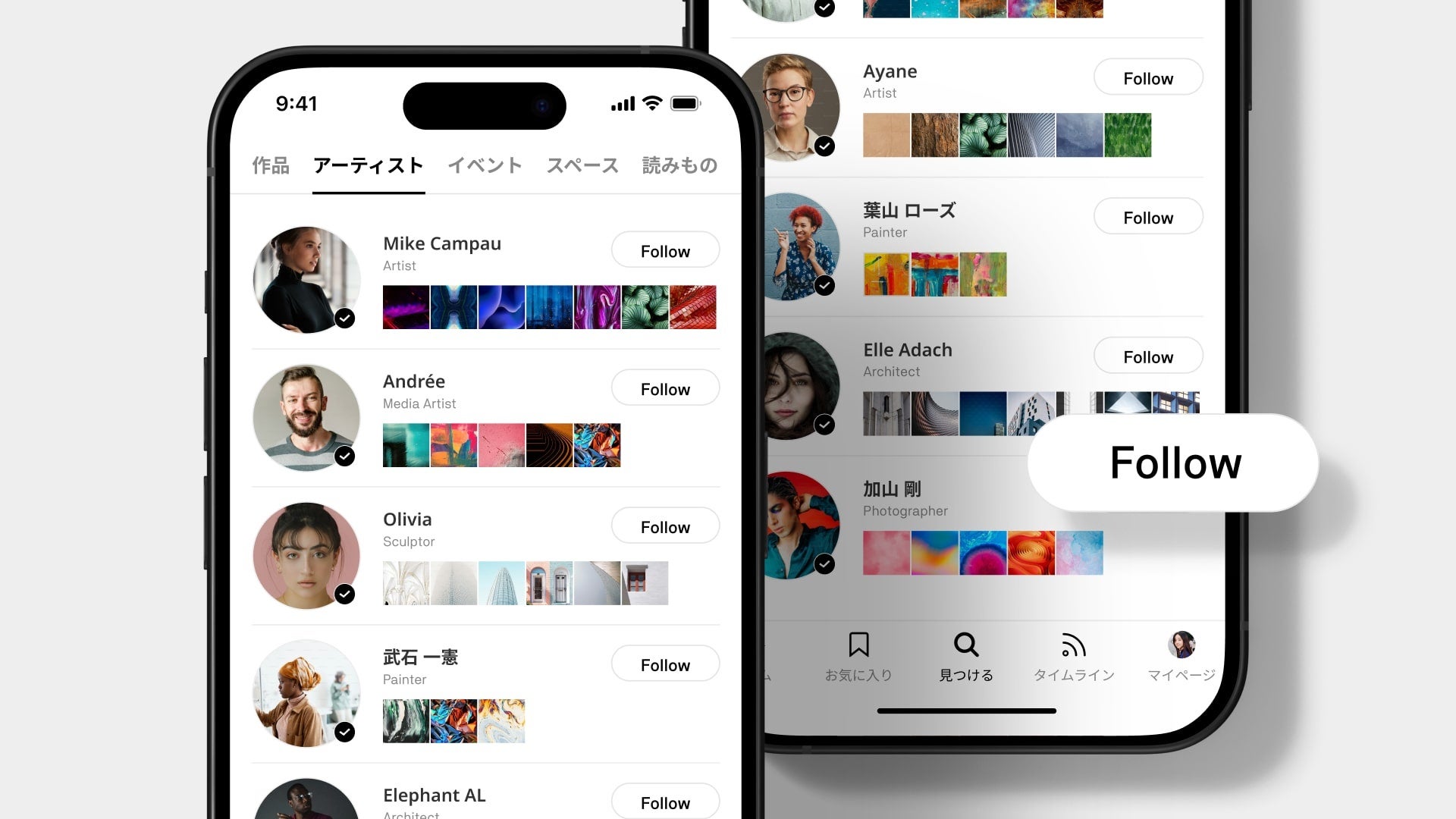 ・お気に入りのアーティストが見つかったら、ぜひArtSticker上でフォローしてみてください。フォローしたアーティストの新しい作品の情報は、アプリ内のお知らせやPUSH通知、メールで受け取ることができます。