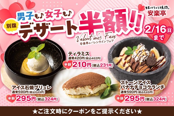 【安楽亭】★バレンタイン★2月11日~16日まで期間限定★男子も女子も別腹人気デザートが半額♪焼肉のあとの甘いご褒美をどうぞ。