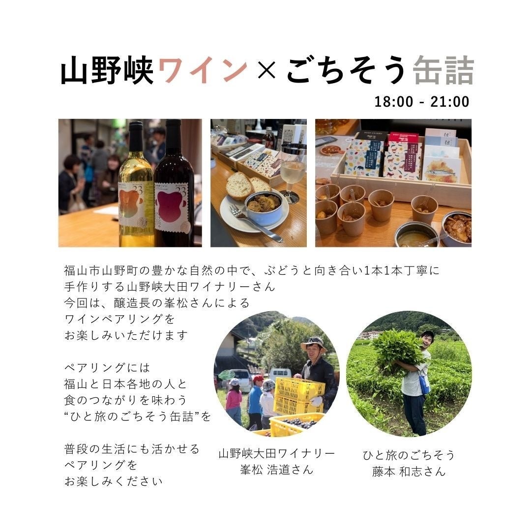 福山市山野町の豊かな自然の中で、ぶどうと向き合い1本1本ていねいに手作りする山野峡大田ワイナリーさん。本イベントでは、ワイナリー醸造長の峯松さんによるワインペアリングをお楽しみいただけます。ペアリングには、福山と日本各地の人と食の つながりを味わう“ひと旅のごちそう缶詰”をご用意!普段の生活にも活かせるペアリングをお楽しみください。