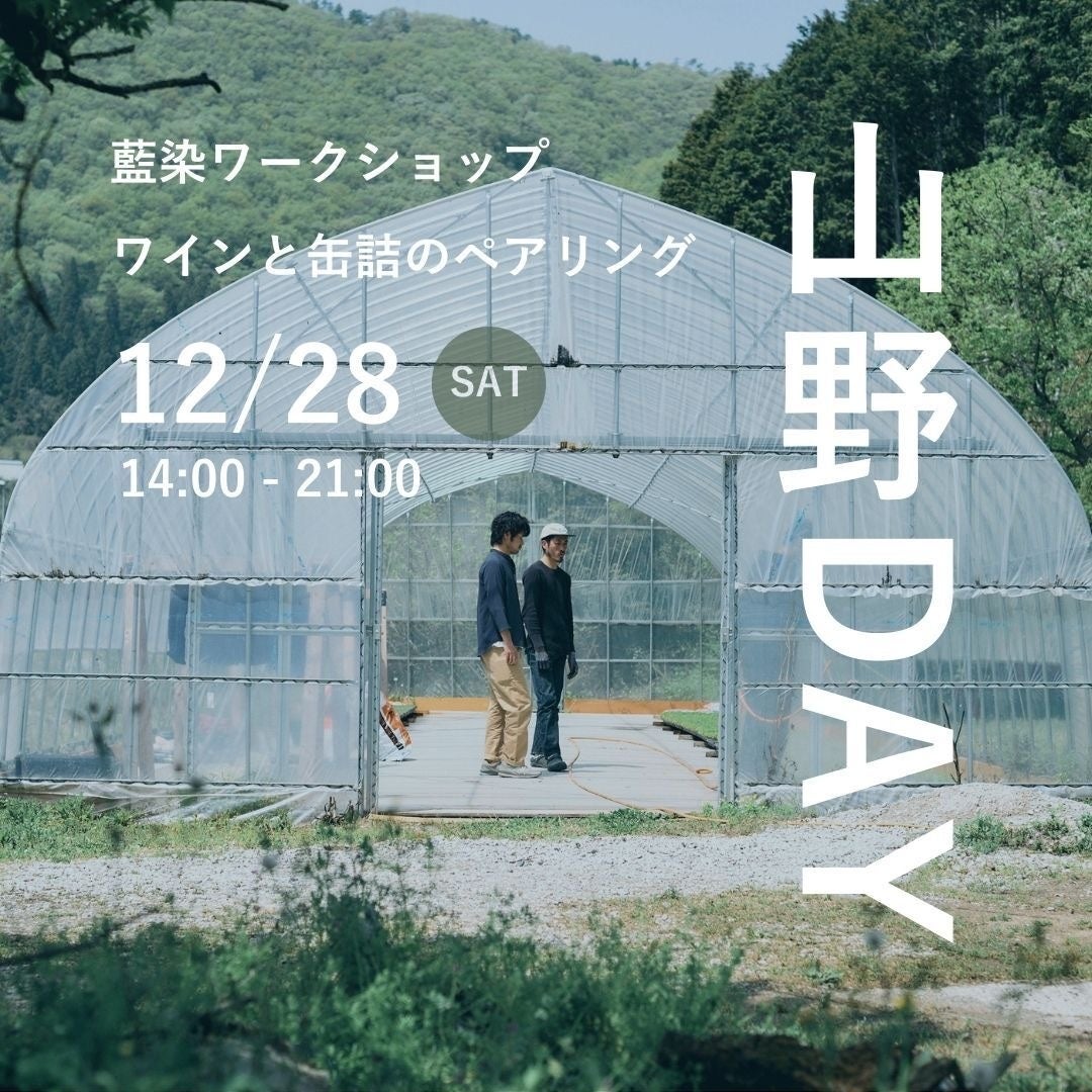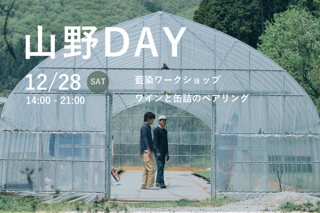 当日は、①山野町で藍の栽培から染料となる蒅(すくも)作り、藍染までを一貫して行う藍屋テロワールによる藍染体験、②山野町の豊かな自然の中でぶどうと向き合い1本1本ていねいに醸造する山野峡大田ワイナリーのワインと日本各地の人と食のつながりを味わうプロジェクト「ひと旅のごちそう」のごちそう缶詰のワインペアリング体験をご用意しています。体験はもちろんのこと、山野町を舞台に活躍するプレイヤーとの会話もゆったりお楽しみください。また、12月26日からイベント当日までの3日間、多くの方々に山野町の魅力を知っていただくべく、463PARLOURでは山野町の紹介展示も予定しています。
