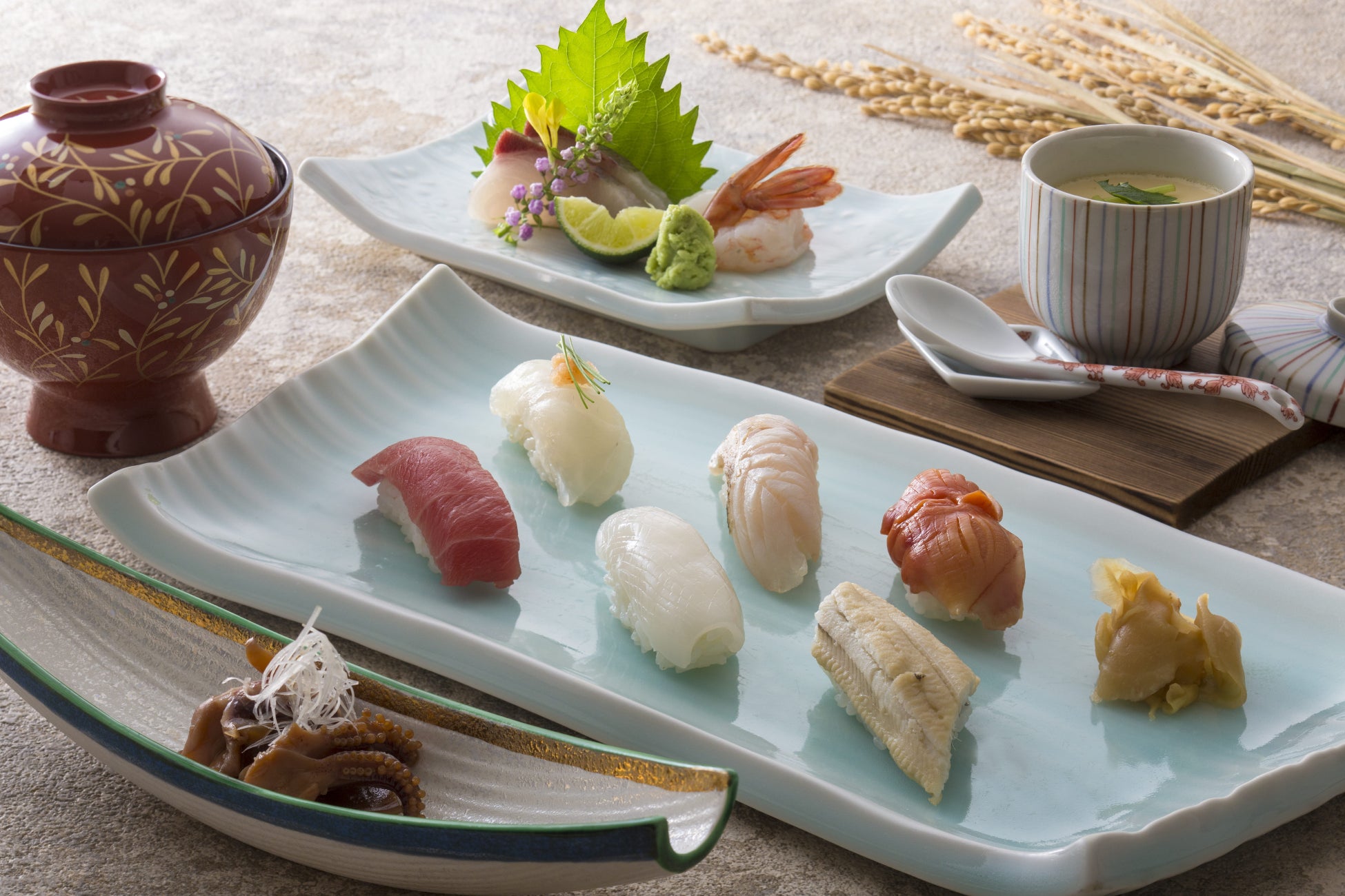 新鮮な魚介の握りがメインのコース。料理長が推す珠玉ネタは、ノドグロと赤貝。皮目を軽く炙ったノドグロは塩をあて、この時期ならではの濃厚な旨みを際立たせて。赤貝は特有のコリッとした食感と芳醇な海の香りが堪能できる一貫。造りにはボタンエビなども登場する旬魚満載の馳走をお愉しみください。