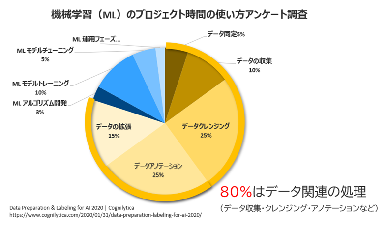 Cognilyticaアナリスト企業によると、AIプロジェクト時間の80%はデータの収集、整理、ラベル付けに費やされているという課題が報告されています。多くの企業がAIサービス開発に取り組んでいますが、AIを学習させるためのデータが不足しています。AIサービスを開発する際にほとんどの時間をデータ準備に費やされているのが現実です。