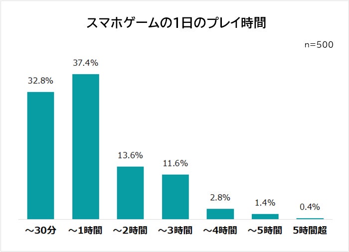 スマホゲームの「1日あたりの平均プレイ時間」は1時間20分。ボリュームゾーンは「1時間以内」で、「30分以内」と答えた人も全体の3割以上いました。仕事をもつ社会人は、長時間プレイするのが難しいからだと考えられます。