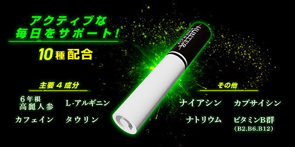 「HUNTER ENERGY」はこれまでに培った技術を活かし、ノンニコチン茶葉スティックに古来より食品として摂取されてきた、高麗人参、L-アルギニン、タウリン、ナイアシン、ナトリウム、カフェインなどヒトの健康維持に不可欠なビタミン、ミネラル、アミノ酸を配合している。ニコチン0mg※2、カロリー/糖質/脂質ゼロ!※3