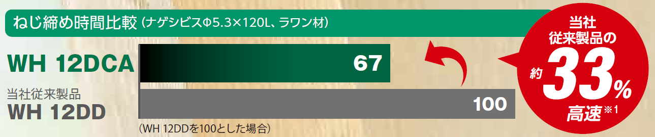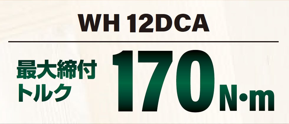 10.8Vにトリプルハンマを初採用し、ねじ締め速度が当社従来製品(WH 12DD)と比べると約33%もアップしました。最大トルクは170N・mです。